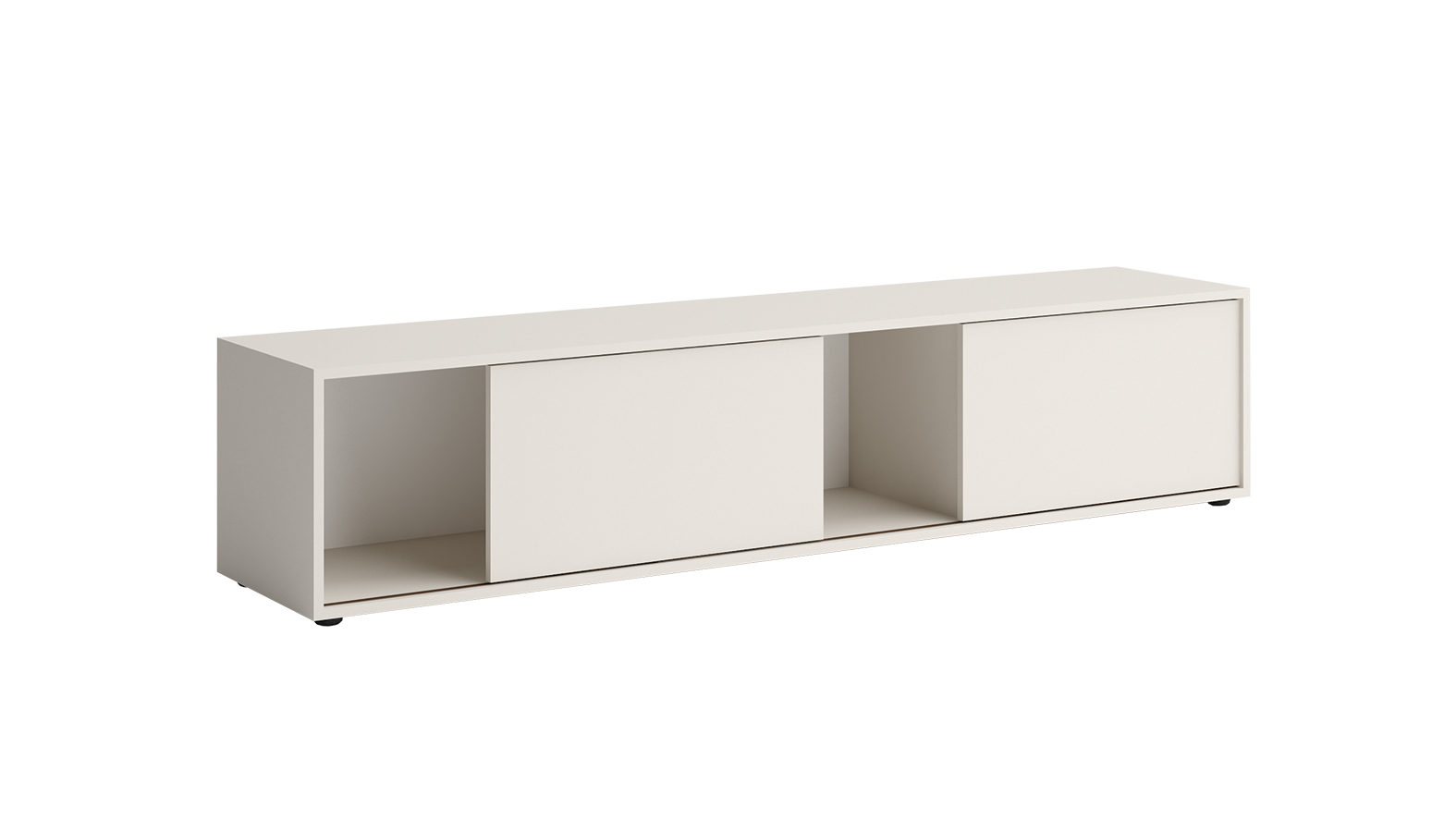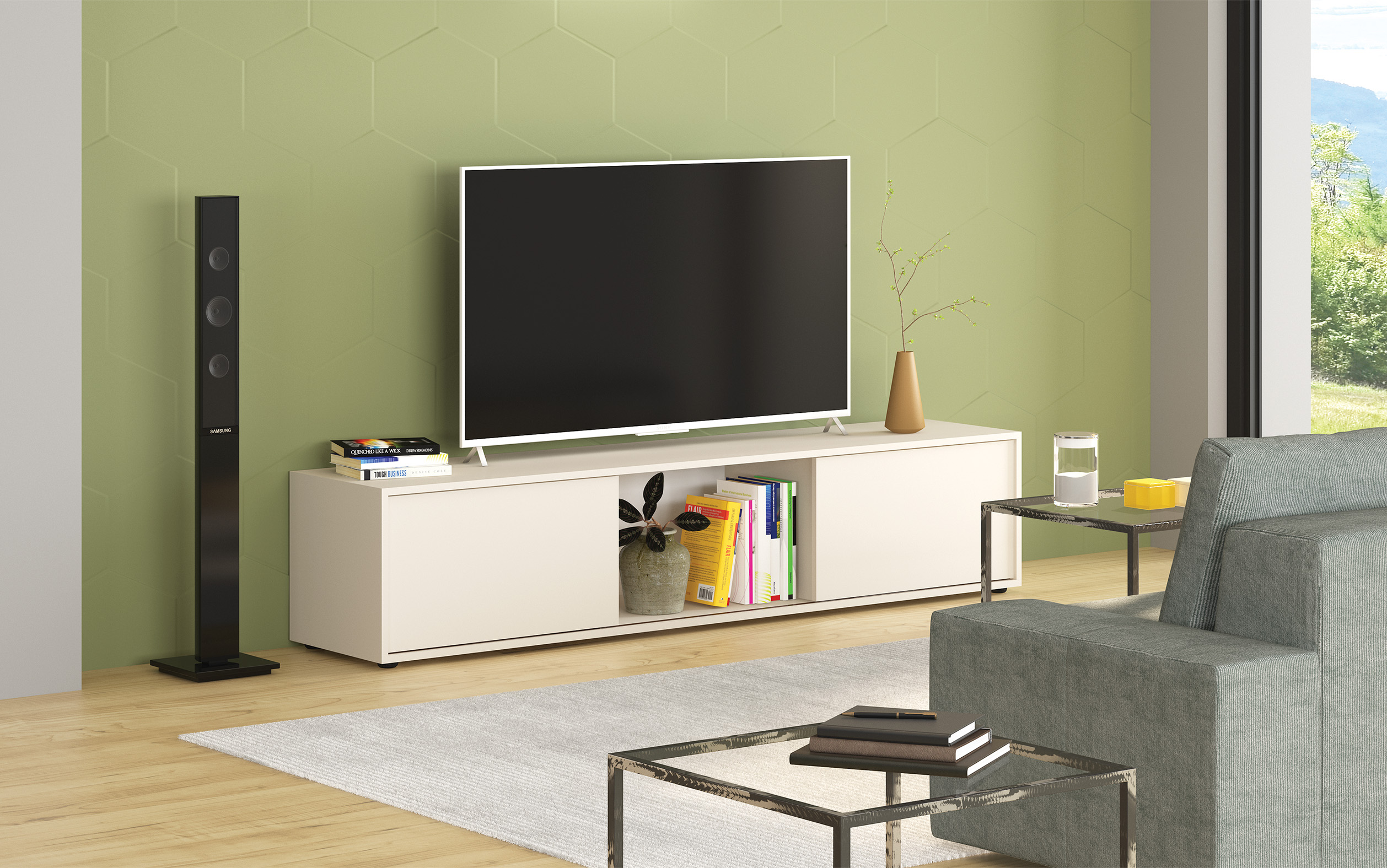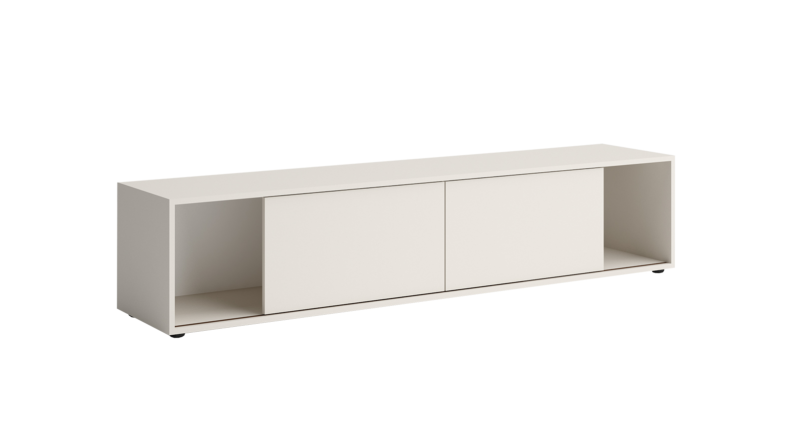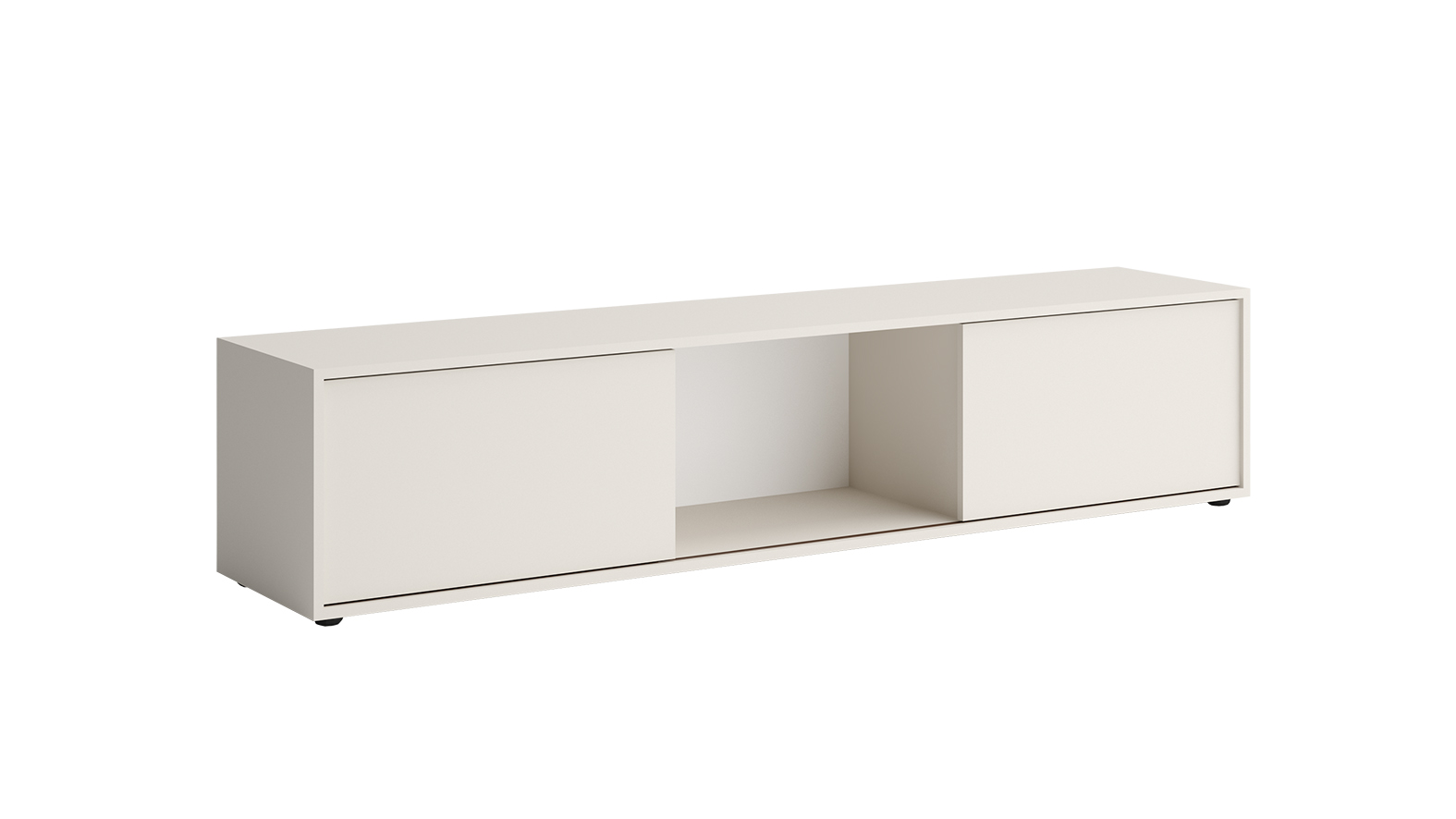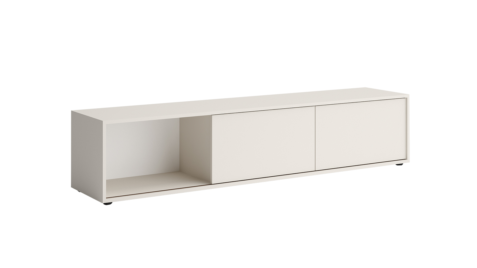 O comodă TV modernă și versatilă, cu structură elegantă, include un loc pentru televizor, două dulapuri și o nișă. Designul flexibil al modulului permite reconfigurarea elementelor (locul dulapurilor și nișei) oferind libertatea de a personaliza aranjamentul în funcție de preferințele și nevoile fiecărui utilizator.