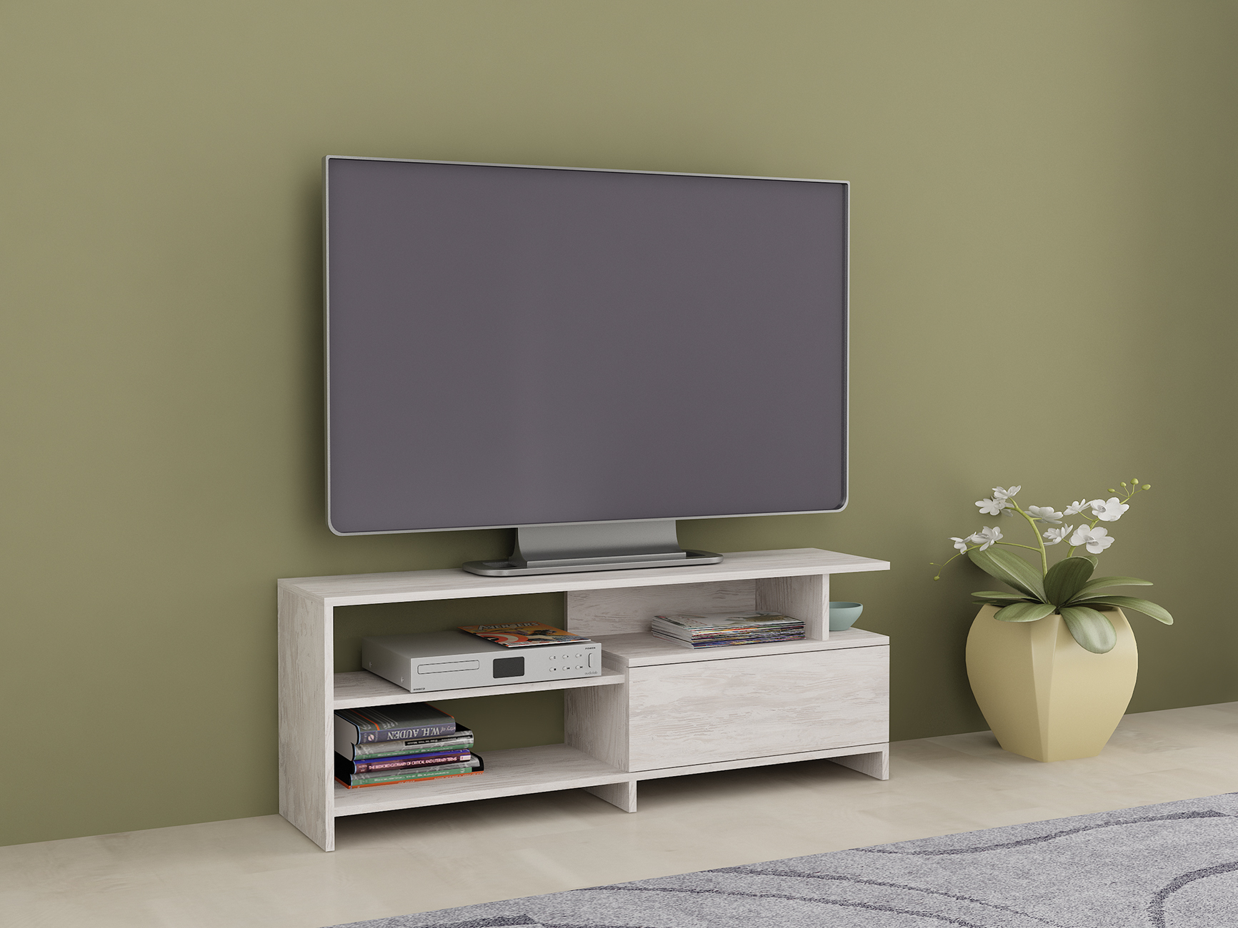 Comoda TV Alfa 70 este un modul elegant și funcțional, iar designul său echilibrat include un spațiu central dedicat televizorului, având încadrat armonios câteva rafturi, care sunt ideale pentru organizarea accesoriilor mici. În partea inferioară, un dulap închis oferă un loc discret pentru depozitarea obiectelor mai mari și mai puțin utilizate.