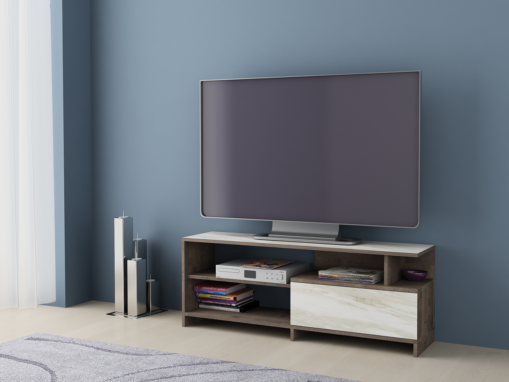 Comoda TV Alfa 70 este un modul elegant și funcțional, iar designul său echilibrat include un spațiu central dedicat televizorului, având încadrat armonios câteva rafturi, care sunt ideale pentru organizarea accesoriilor mici. În partea inferioară, un dulap închis oferă un loc discret pentru depozitarea obiectelor mai mari și mai puțin utilizate.