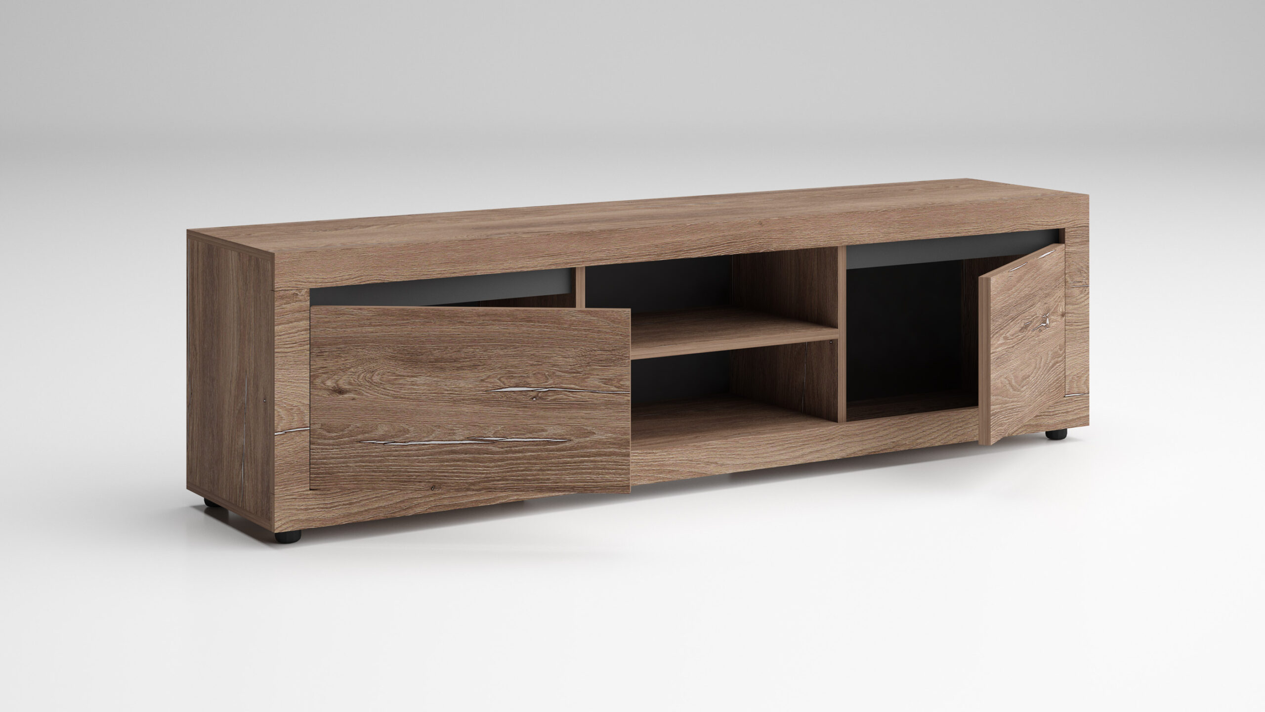 O comodă TV elegantă și funcțională, concepută pentru a îmbina utilitatea cu un design modern. Partea centrală este dedicată televizorului; dedesubt, două rafturi ideale pentru obiecte mici, iar pe laterale, două dulapuri cu uși care completează ansamblul, oferind suficient spațiu pentru depozitarea obiectelor mai mari.