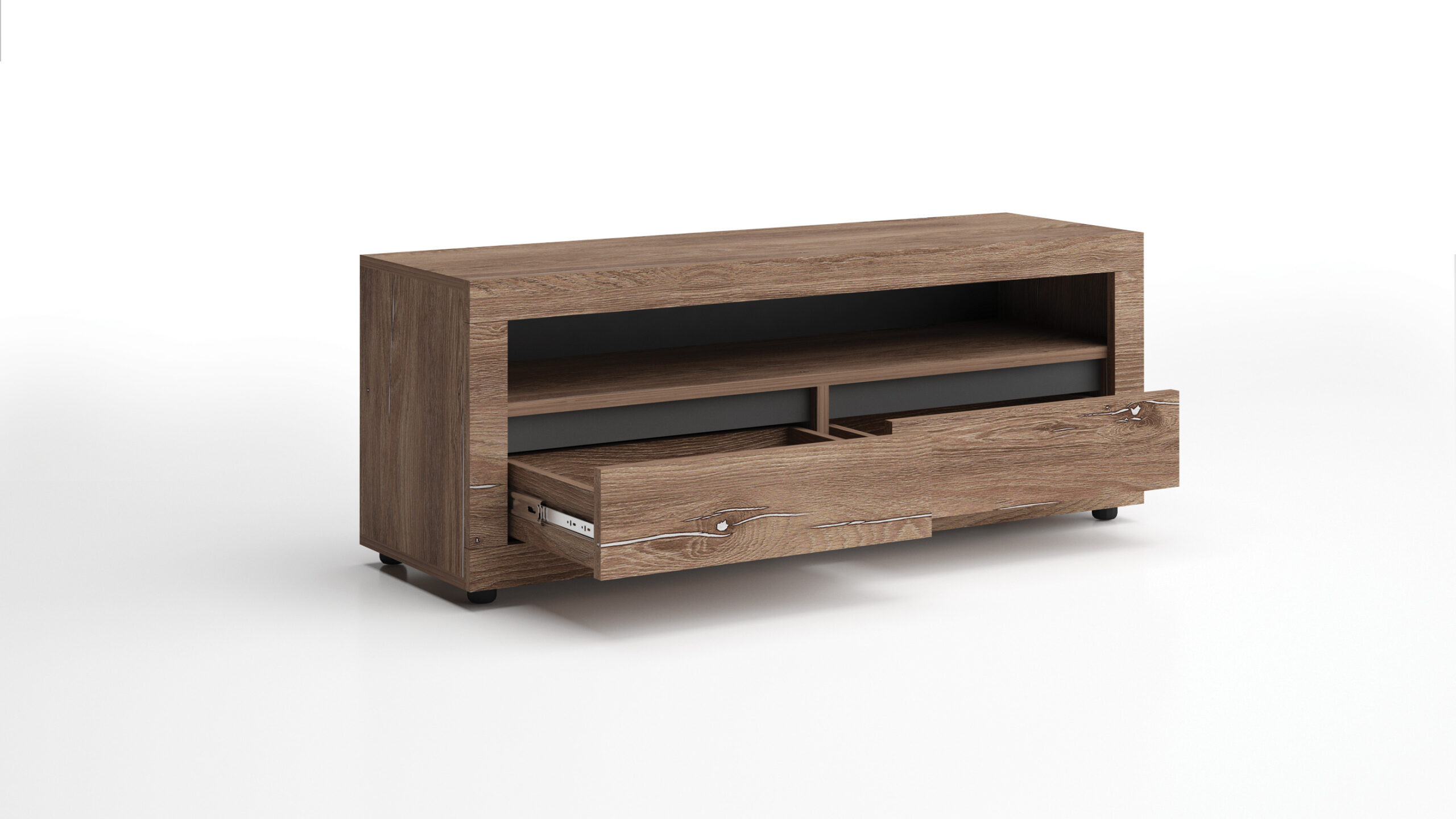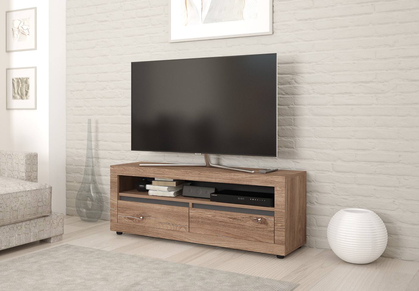 Această comodă TV modernă și funcțională este compusă dintr-un spațiu central destinat televizorului, încadrat de o nișă elegantă care adaugă un plus de profunzime și stil designului. Sub acest spațiu se află două dulapuri încăpătoare, ideale pentru depozitarea accesoriilor multimedia, a cărților sau a altor obiecte necesare în living.