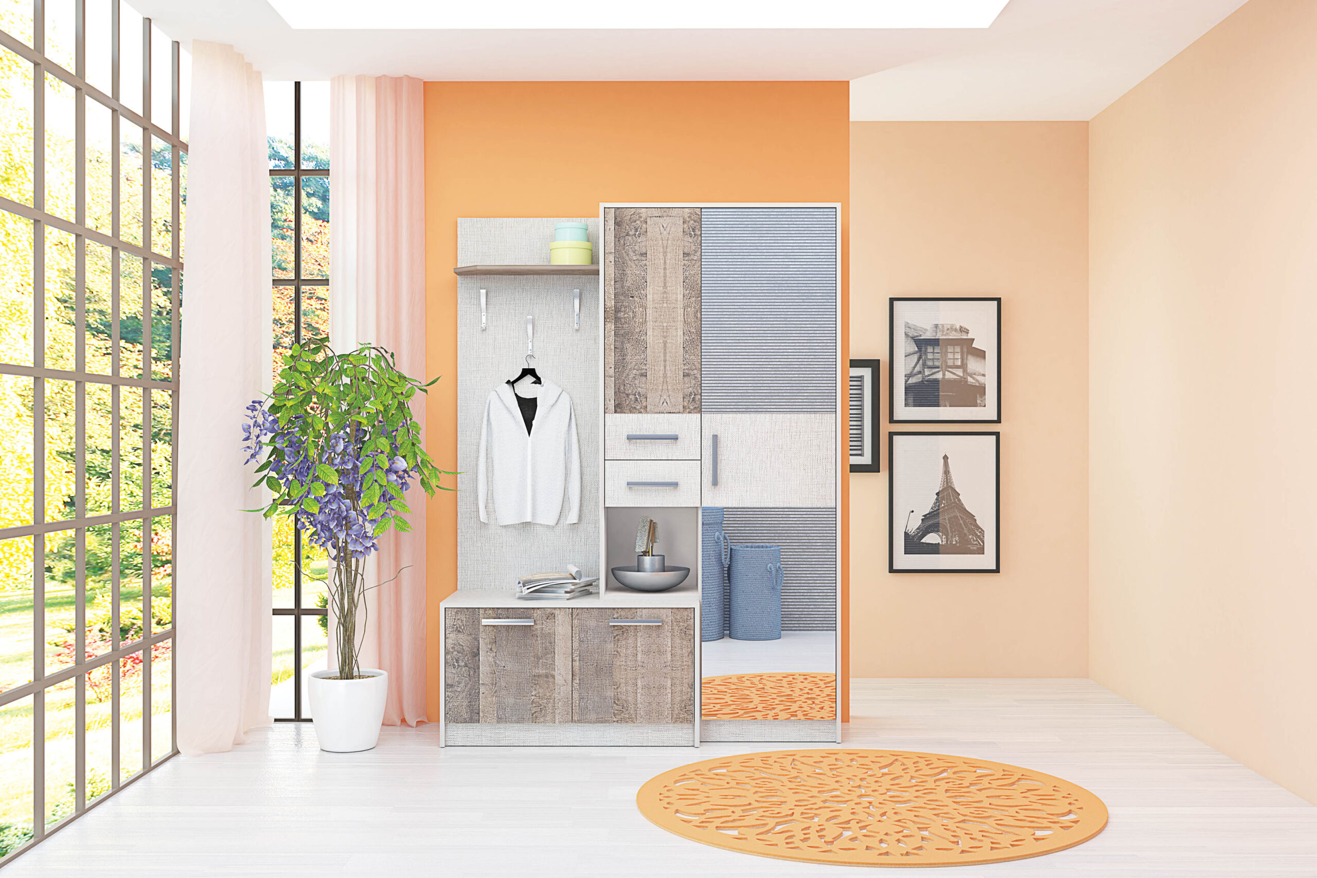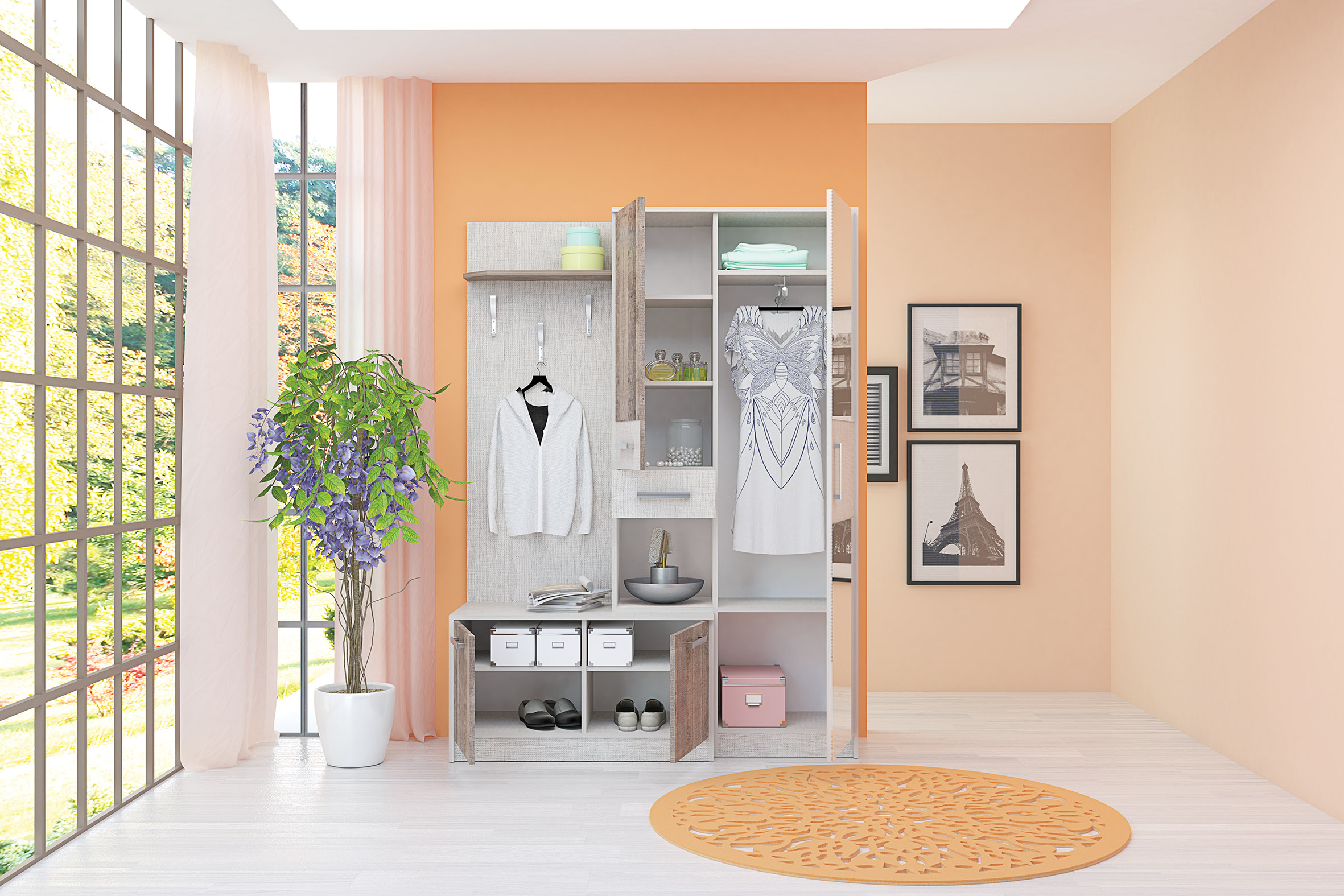 Cuierul Anteros este format dintr-un dulap cu o oglindă, un panou cu agățătoare, două dulapuri inferioare de încălțăminte, precum și un raft, un dulăpior, un sertar și o nișă pe mijloc pentru obiecte mici.