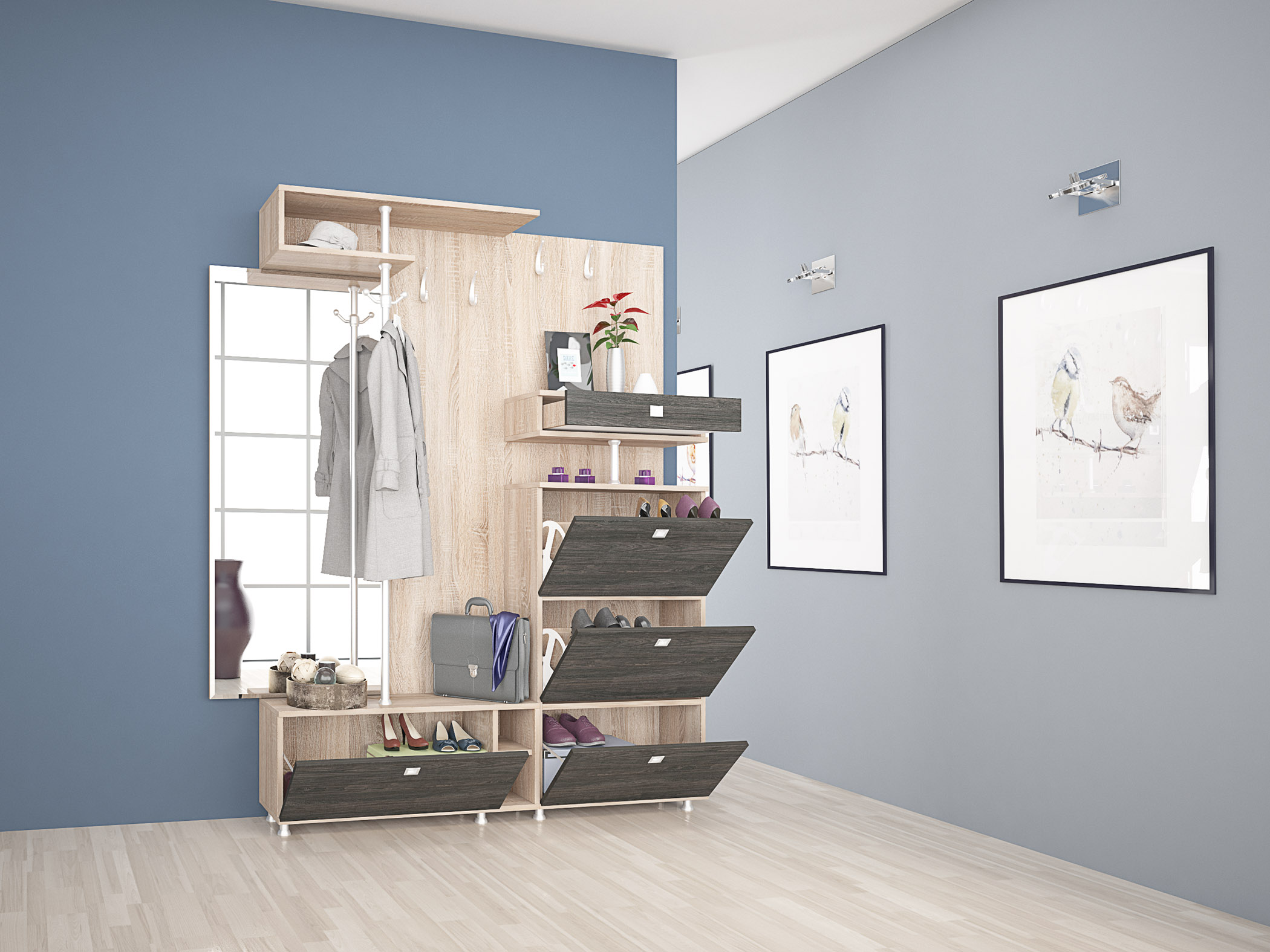 Cuierul Santa Fe include un sertar pentru obiecte mici și patru dulapuri pentru încălțăminte, dintre care două sunt dotate cu mecanism special pentru pantofar. De asemenea, acest cuier include și un panou cu agățătoare, o bară verticală cu umerașe și o oglindă mare cu design netradițional care iese din structura cuierului.