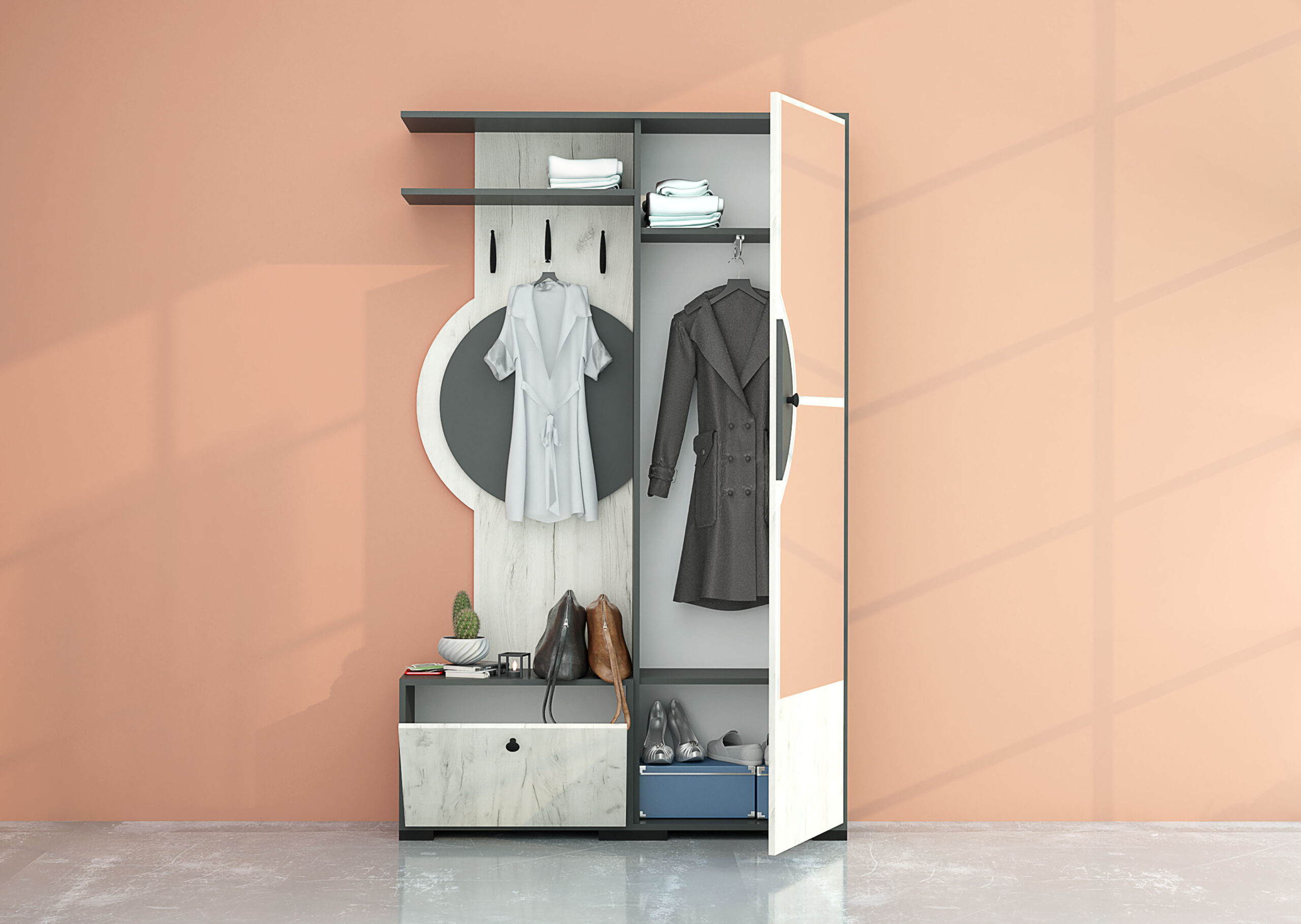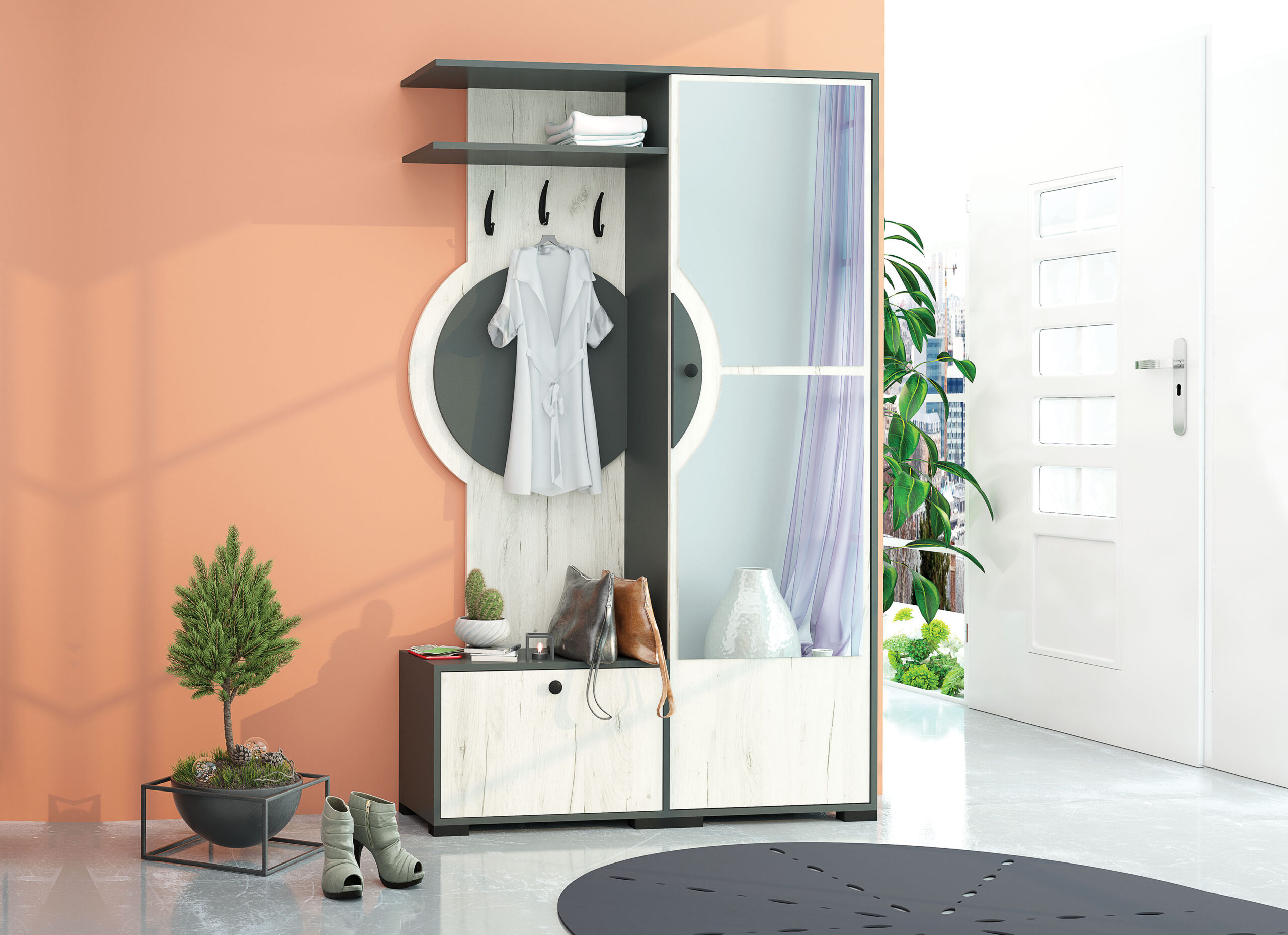 Cuierul Fini dispune de un dulap cu o ușă cu oglindă, un spațiu inferior pentru depozitarea pantofilor, un raft superior suplimentar și un panou cu trei agățătoare.