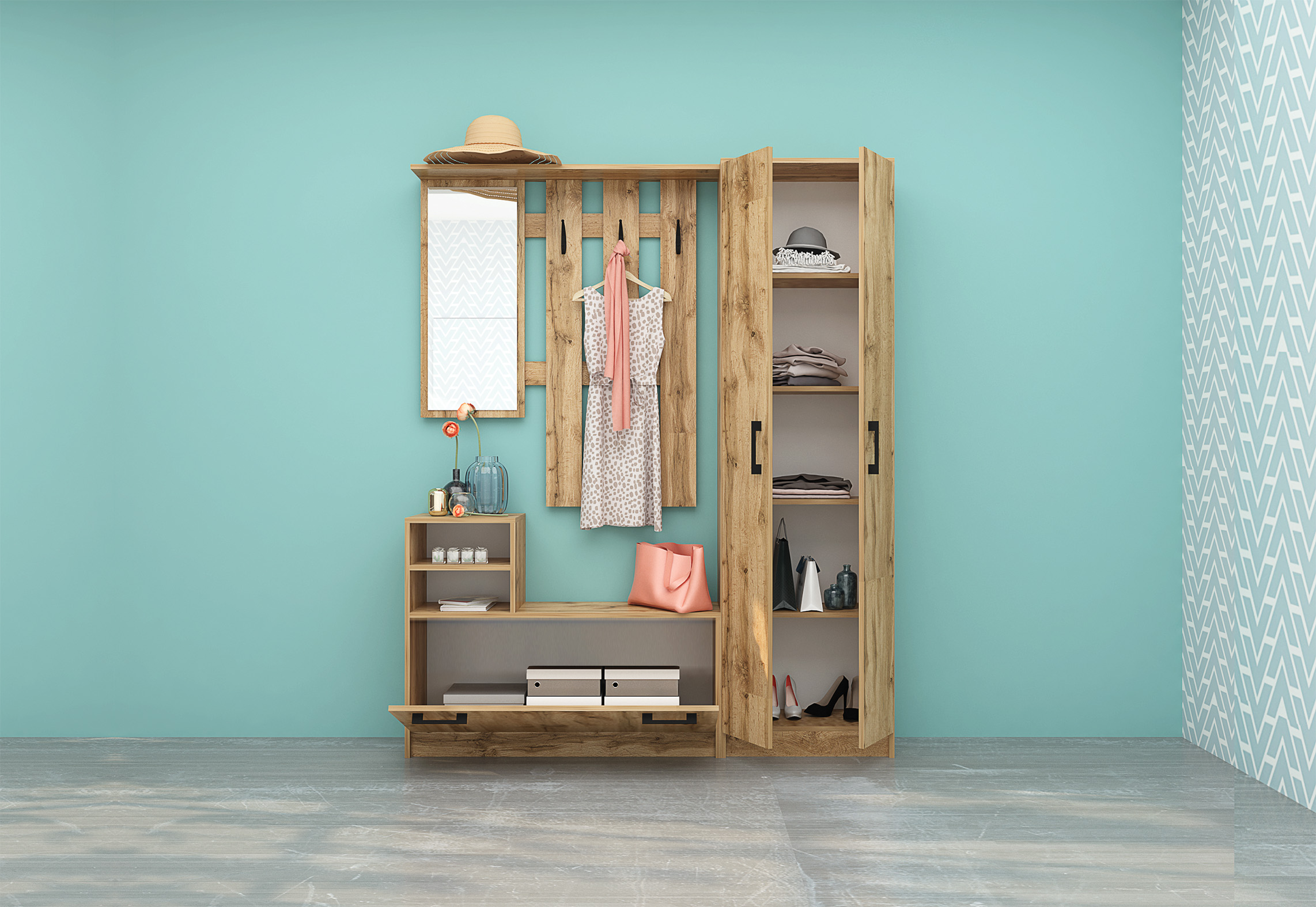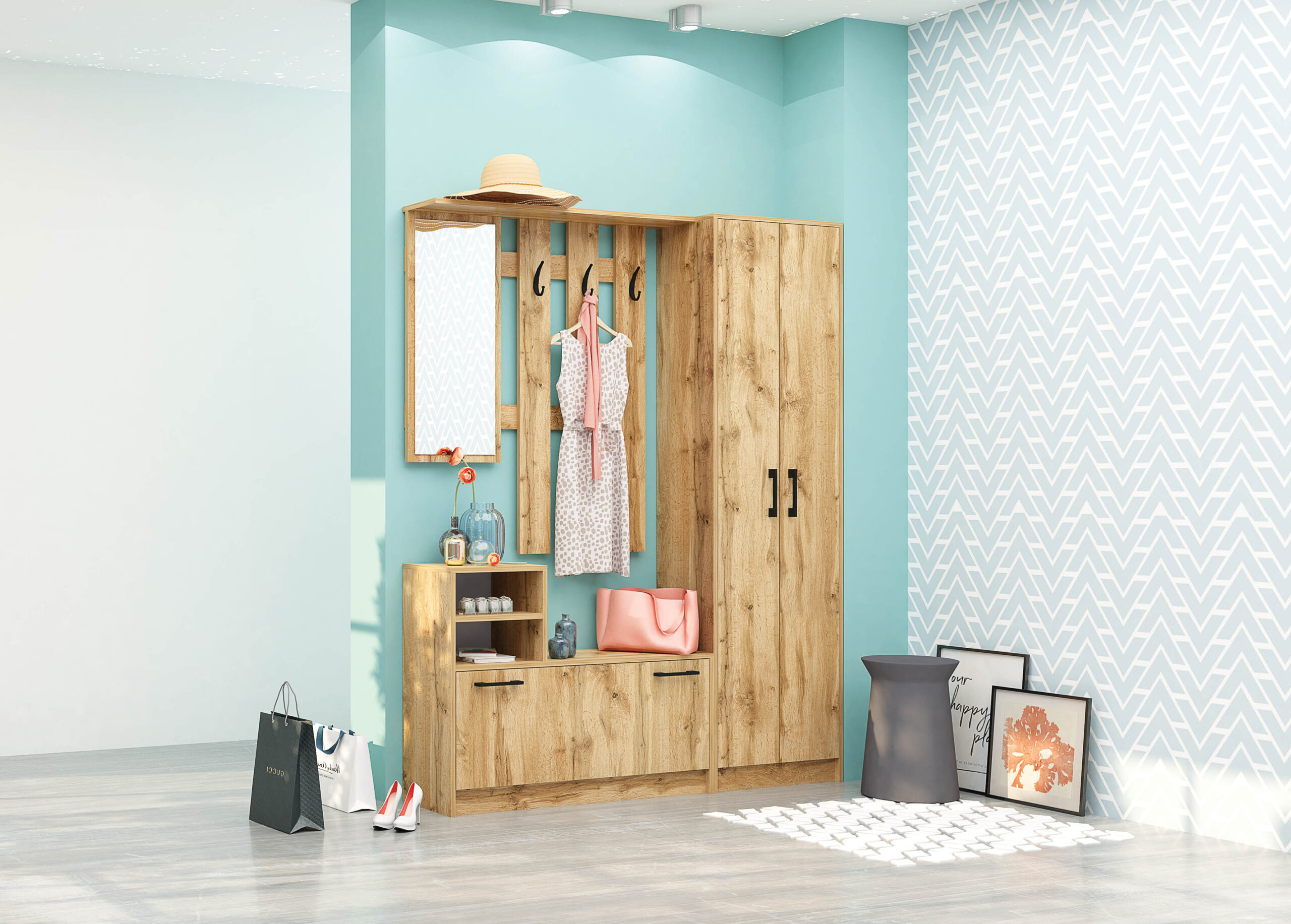 Cuierul Valya dispune de un dulap pentru haine, un dulăpior inferior pentru încălțăminte, un panou cu trei agățătoare, o oglindă mică, un raft superior suplimentar și două nișe pentru obiecte.