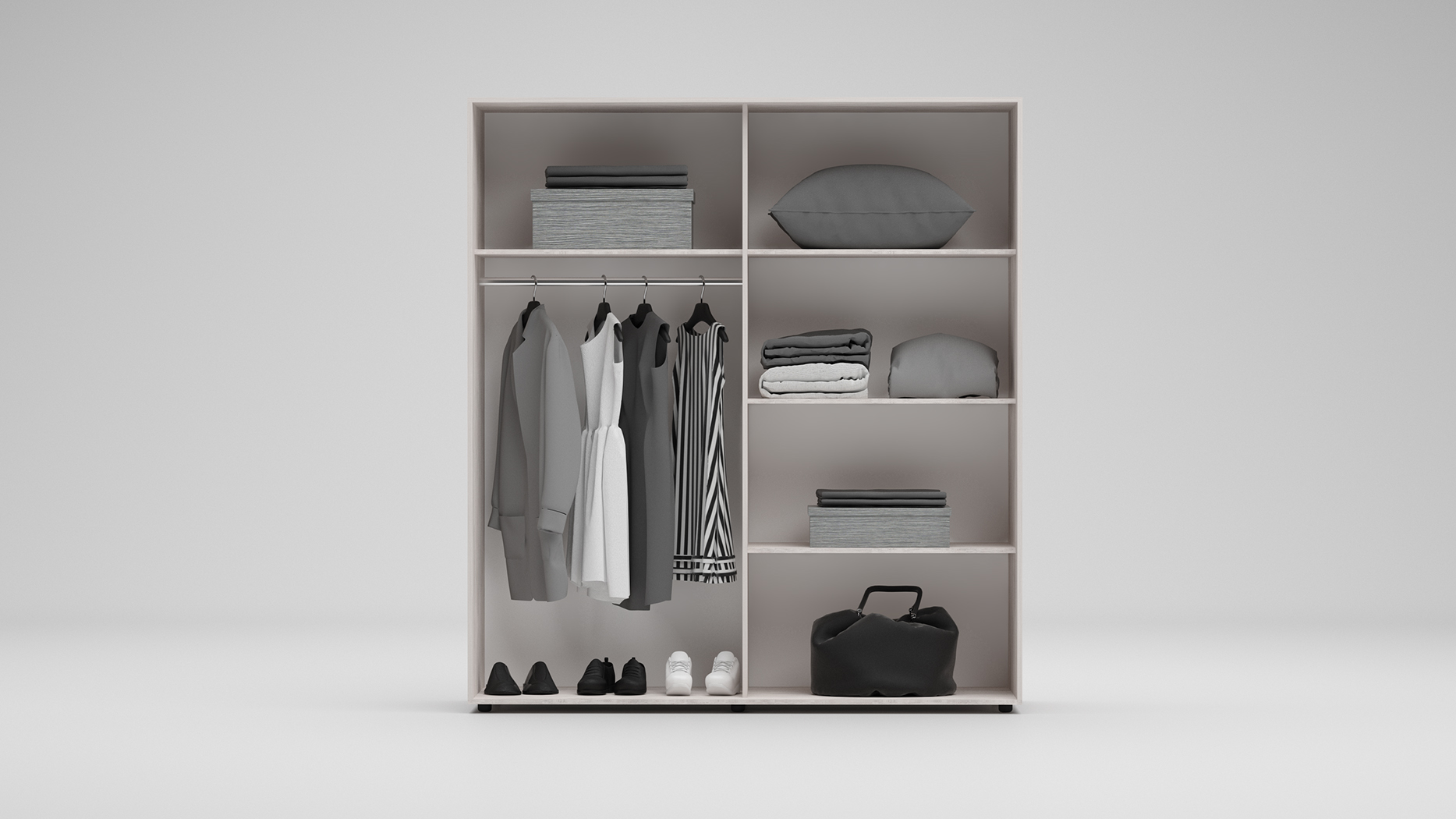 În interior, dressingul dispune de patru rafturi spațioase, oferind suficient loc pentru depozitarea hainelor pliate, lenjeriei, accesoriilor sau altor obiecte. O bară pentru umerașe este inclusă, permițând agățarea rochiilor, cămășilor, sacourilor și a altor articole vestimentare.