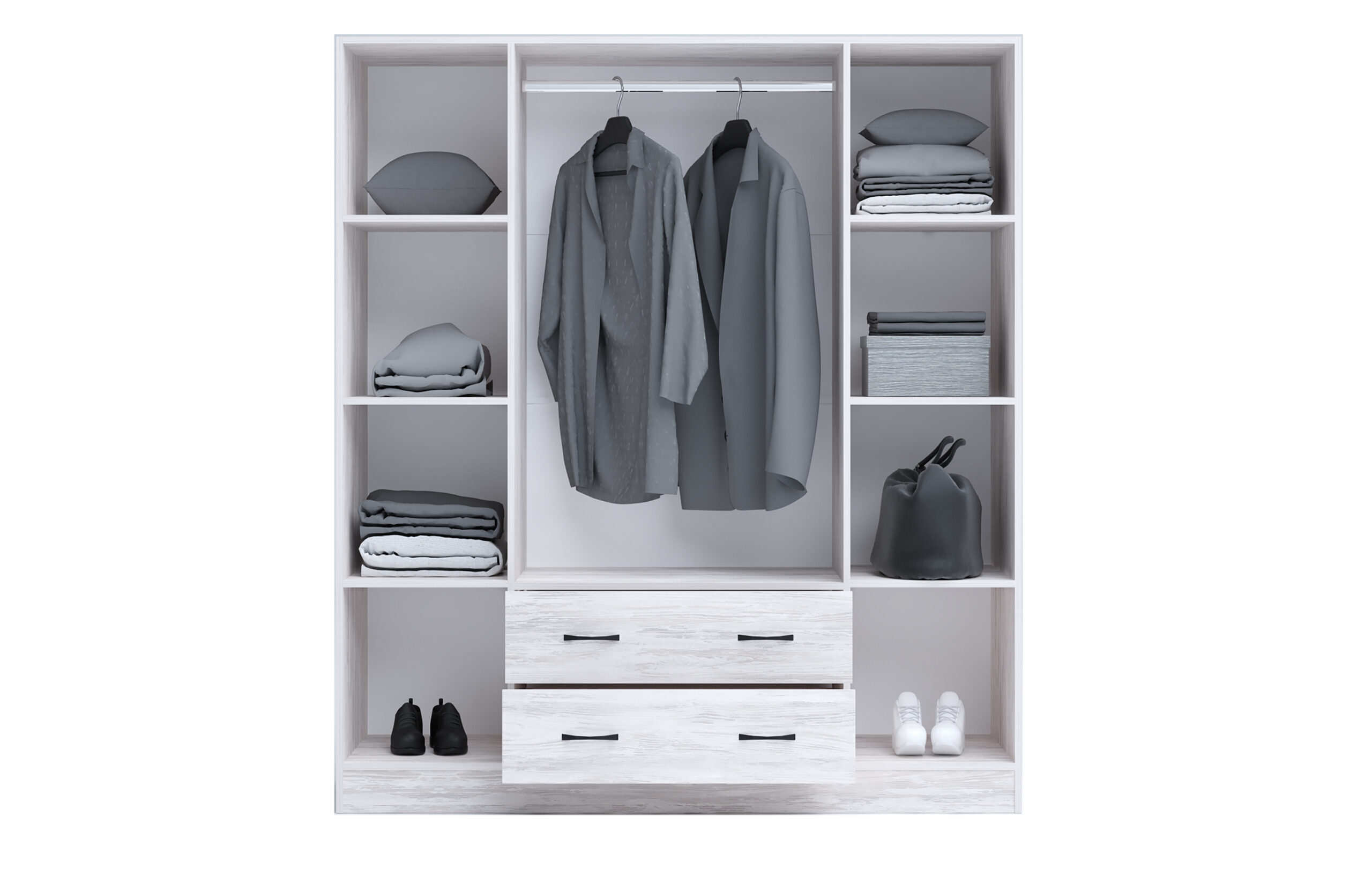 Dulapul Apolo 9 se remarcă prin dimensiunile sale generoase și funcționalitatea complexă. Este prevăzut cu patru uși cu mecanism soft-close, două oglinzi incorporate (adaugând un element practic și estetic), șase rafturi pentru depozitarea rufelor împăturite și două sertare largi, perfecte pentru lenjerie sau accesorii. Bara pentru umerașe, amplasată strategic, oferă spațiu generos pentru haine, permitând o organizare optimă a garderobei.