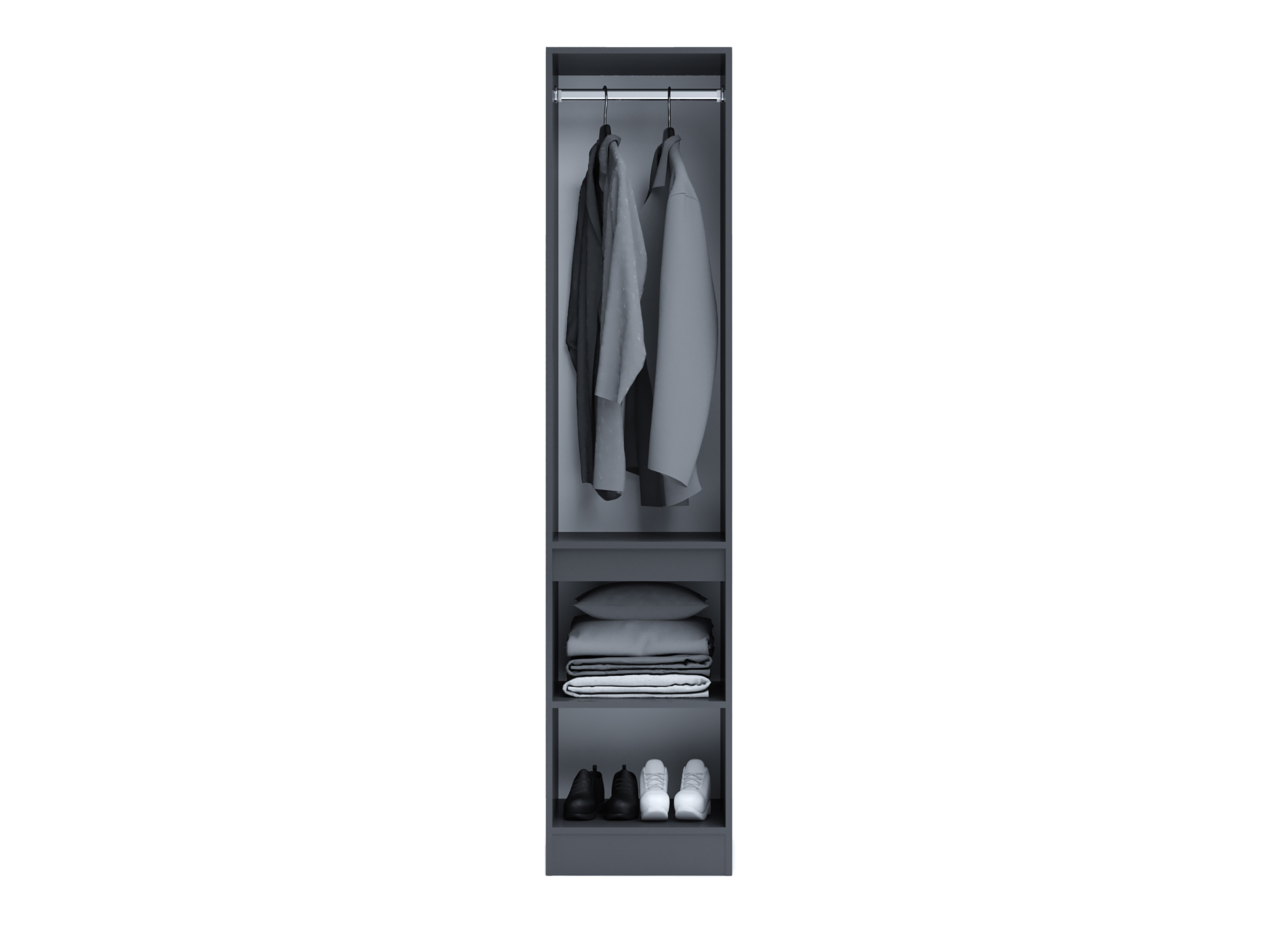 Dulapul Leo 1, cu un design compact și elegant, dispune de două compartimente distincte. Compartimentul superior este prevăzut cu o bară pentru umerașe, iar cel inferior cu spațiu pentru depozitarea hainelor pliate, a plăpumilor sau a încălțămintei. Ușile dispun de mecanism de închidere soft-close, iar pentru o mai bună organizare, se pot achiziționa opțional rafturi suplimentare.