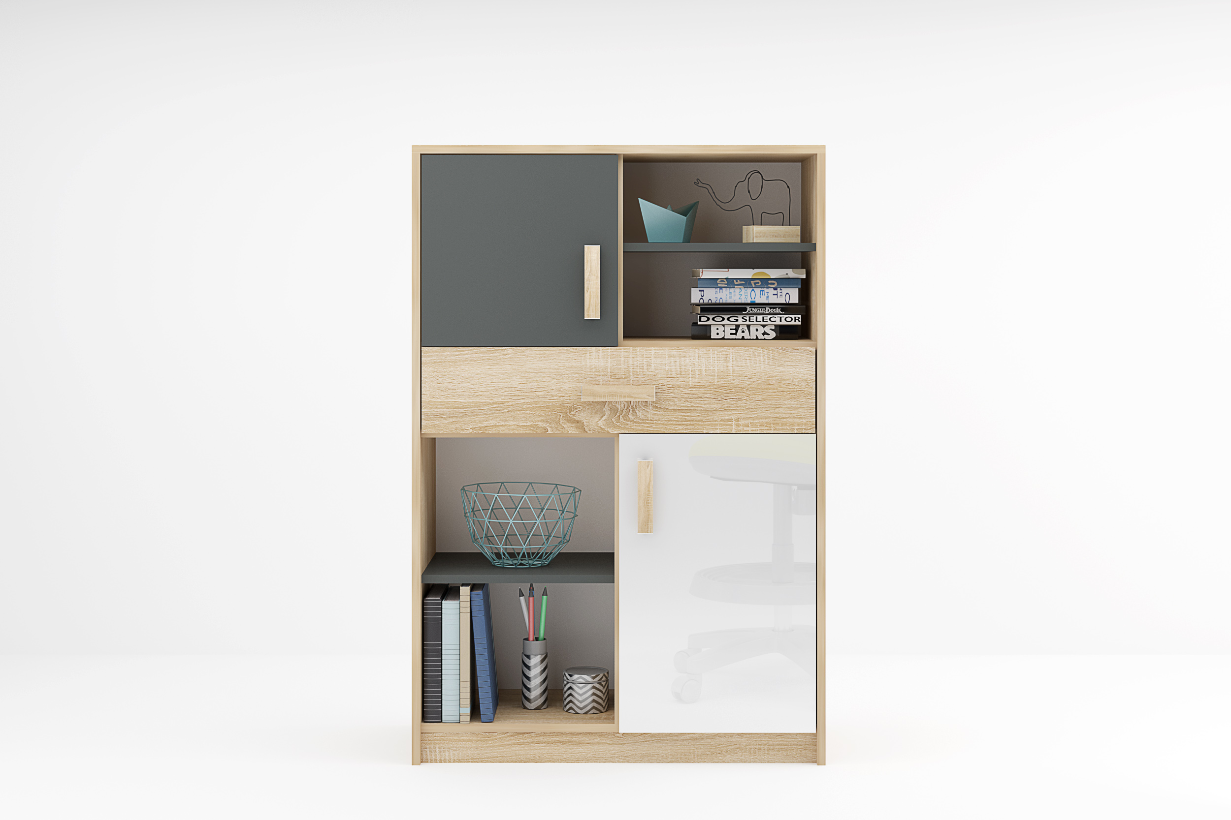 Dulapul Sydney M6 este o piesă de mobilier modernă și compactă, cu design versatil. Oferă compartimente pentru depozitare — dintre care două închise cu uși — completate de nișe deschise ideale pentru obiecte la vedere. În zona centrală, un sertar ușor accesibil păstrează la îndemână accesoriile mici de zi cu zi.
