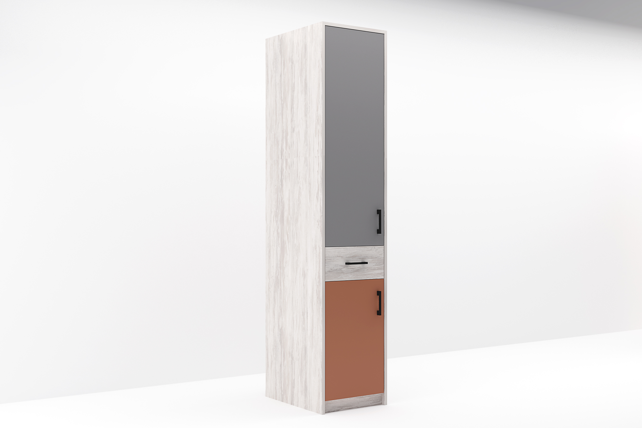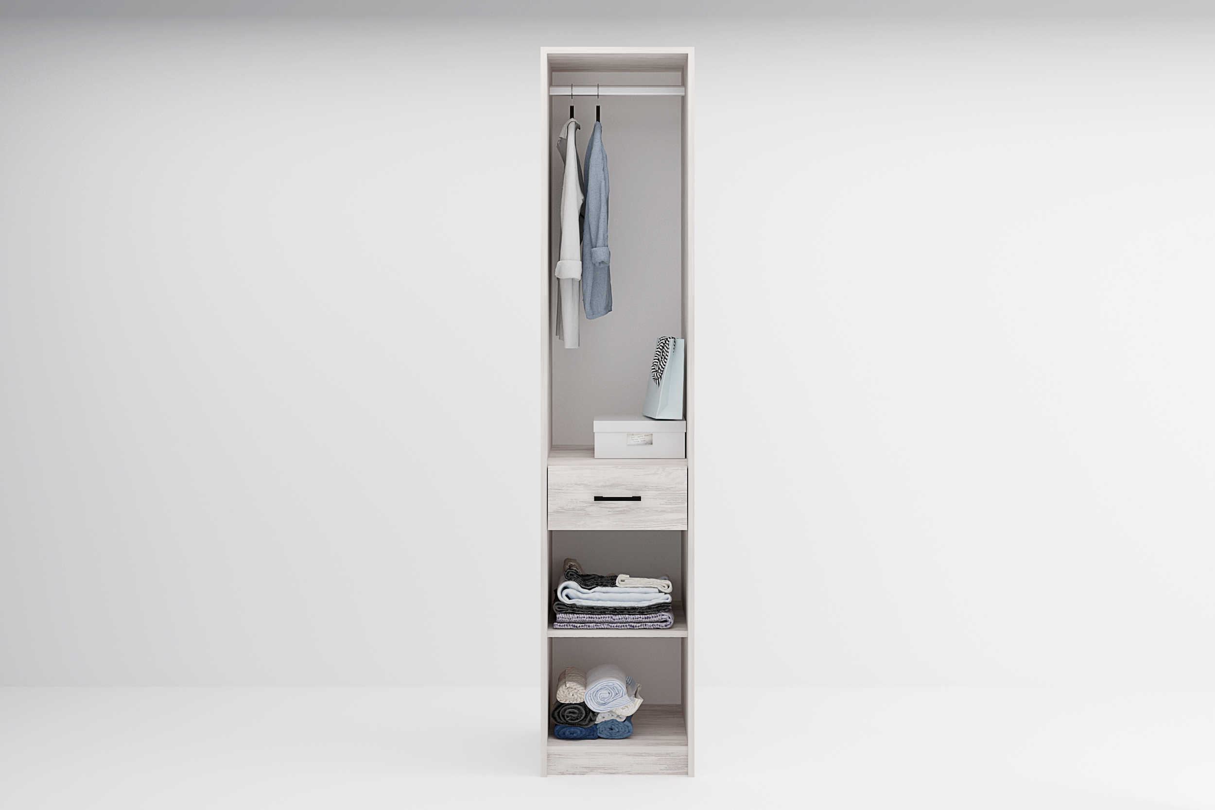 Dulapul Sydney M8 este o piesă de mobilier cu design funcțional și compact, cu două compartimente: partea inferioară este prevăzută cu două rafturi, iar în partea superioară, dulapul dispune de o bară pentru umerașe, ideală pentru a agăța haine. Între cele două compartimente se află și un sertar pentru depozitarea lenjeriei sau a altor obiecte mai mici.