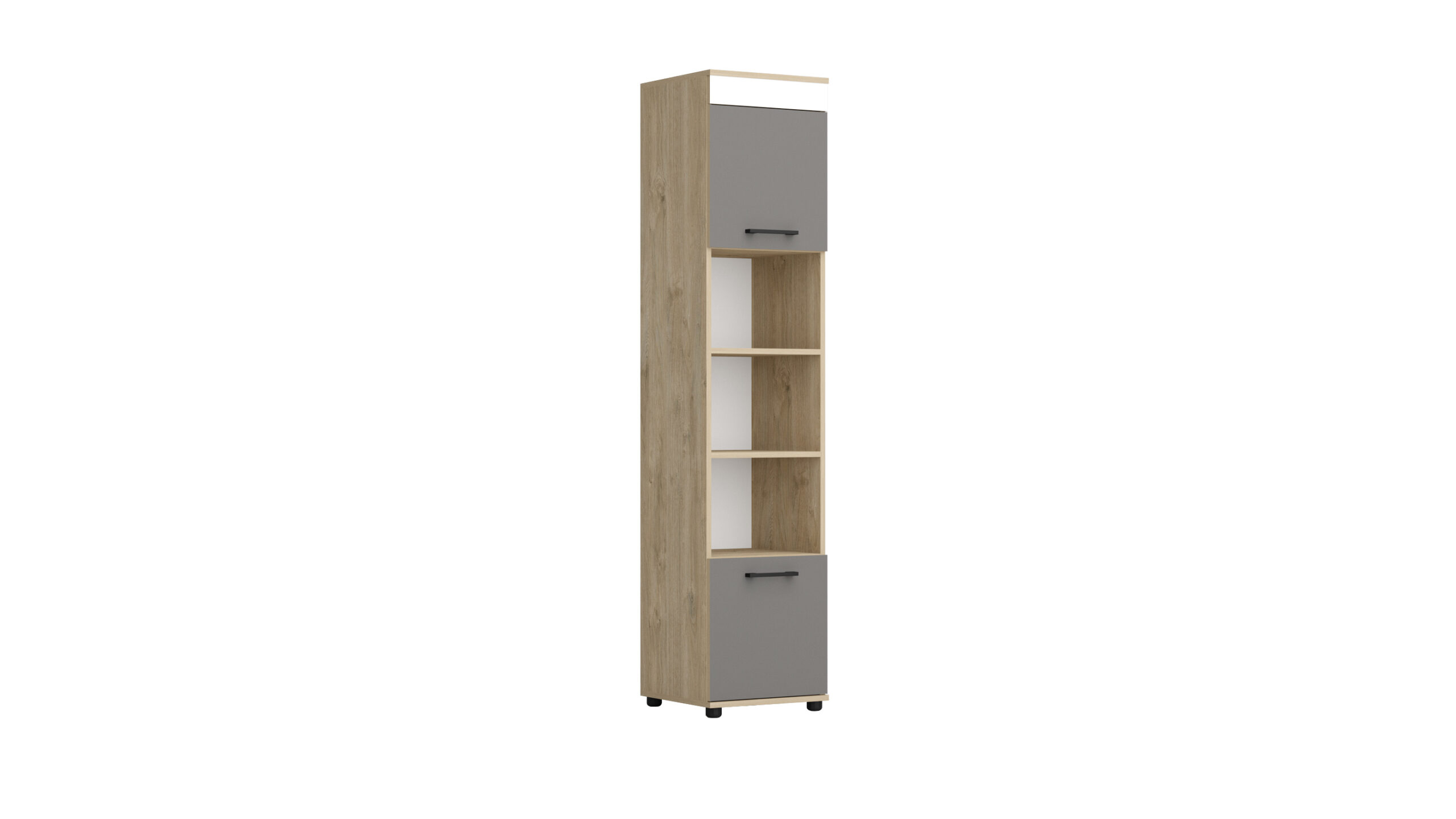 Etajera Kris M16 este o piesă de mobilier modernă și compactă, ideală pentru optimizarea spațiului. Dispune de trei rafturi deschise, perfecte pentru expunerea decorațiunilor sau a cărților, și de două dulapioare cu uși, care oferă spațiu de depozitare închis. Designul său funcțional o face potrivită pentru diverse încăperi, de la living la dormitor sau birou.