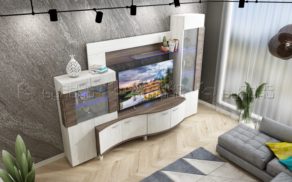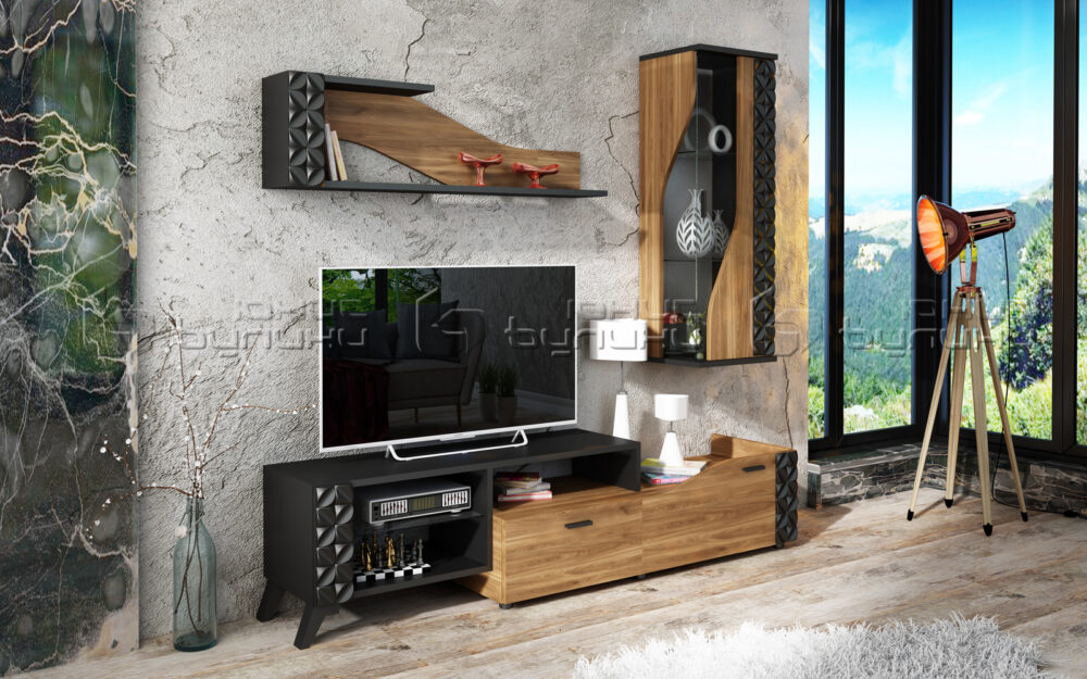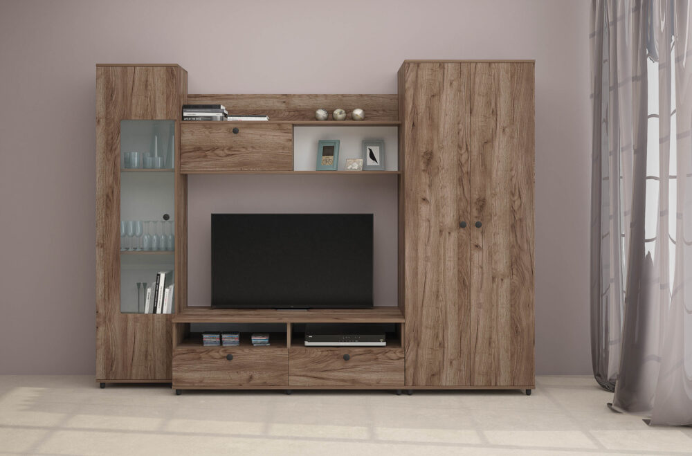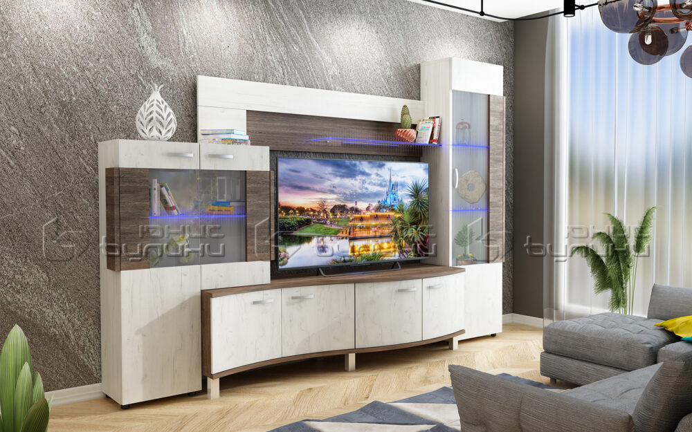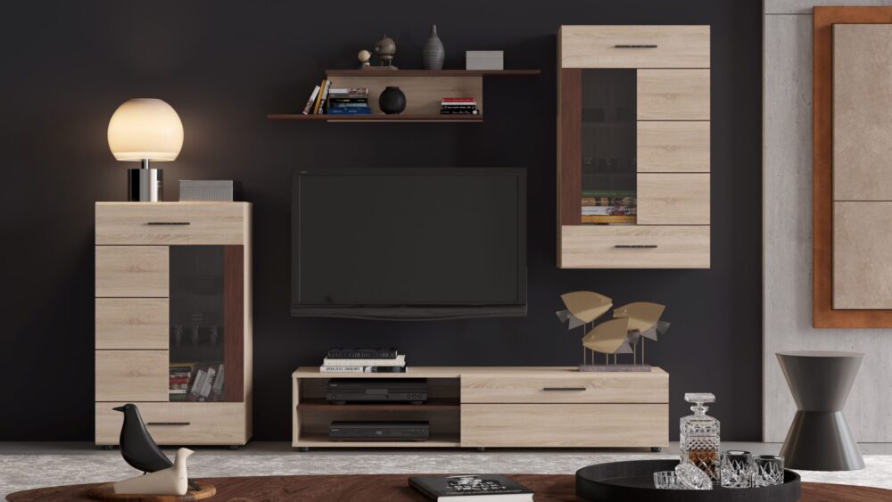 Livingul Baron 3D include dulap înalt cu o ușă și dulap suprapozabil, dulap cu două uși și dulap suprapozabil, 3 vitrine, 3 nișe, 2 sertare și două dulăpioare.