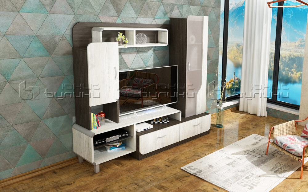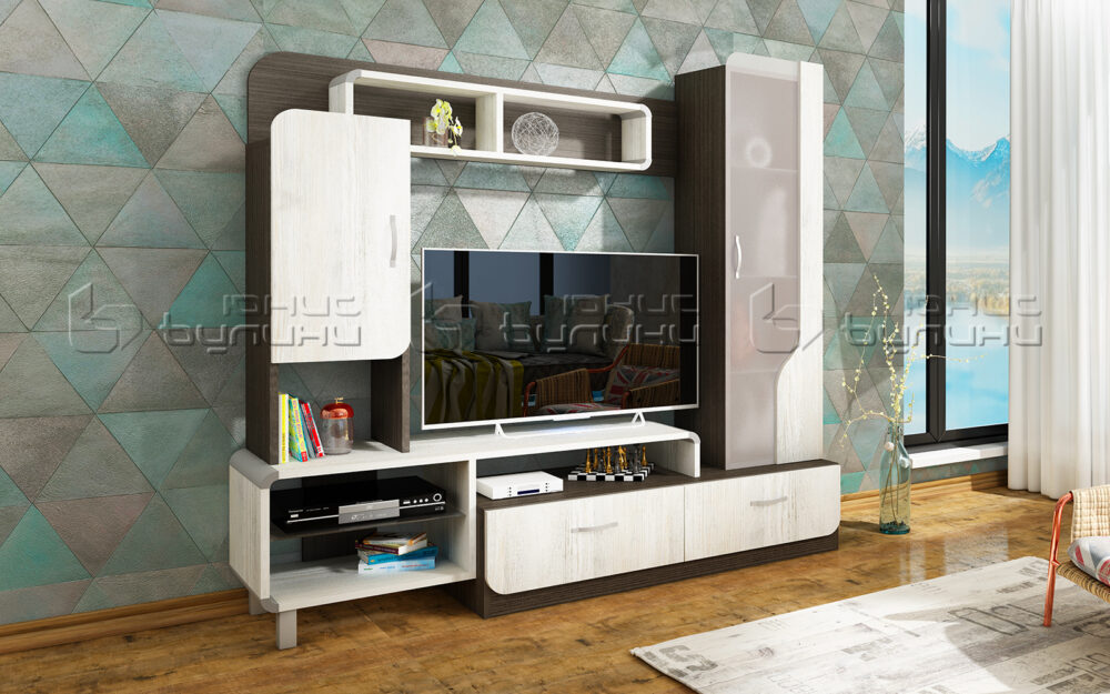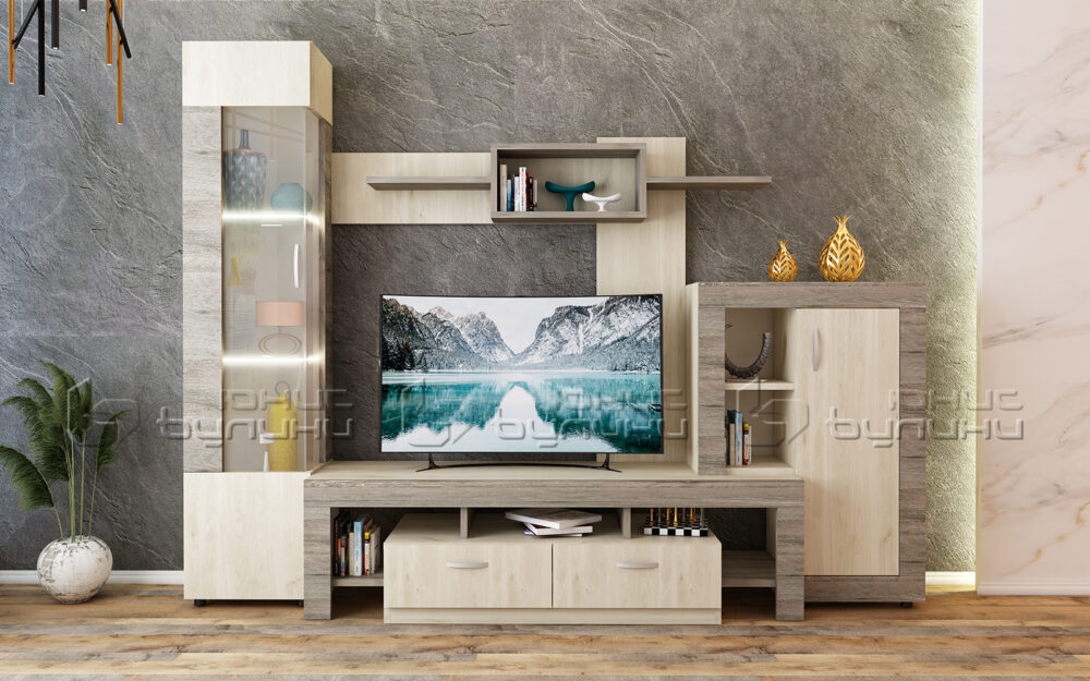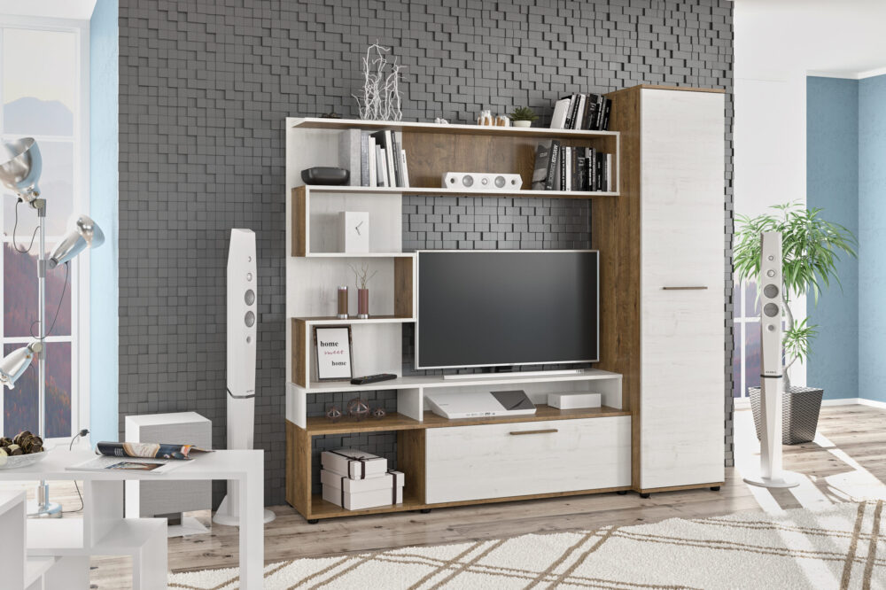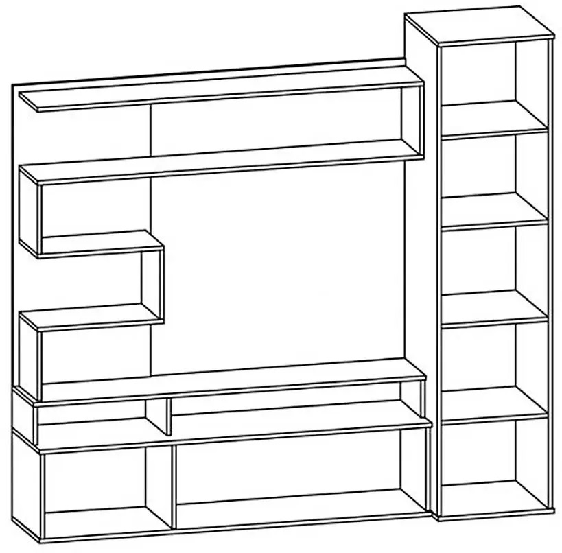 Livingul Baron 3D include dulap înalt cu o ușă și dulap suprapozabil, dulap cu două uși și dulap suprapozabil, 3 vitrine, 3 nișe, 2 sertare și două dulăpioare.
