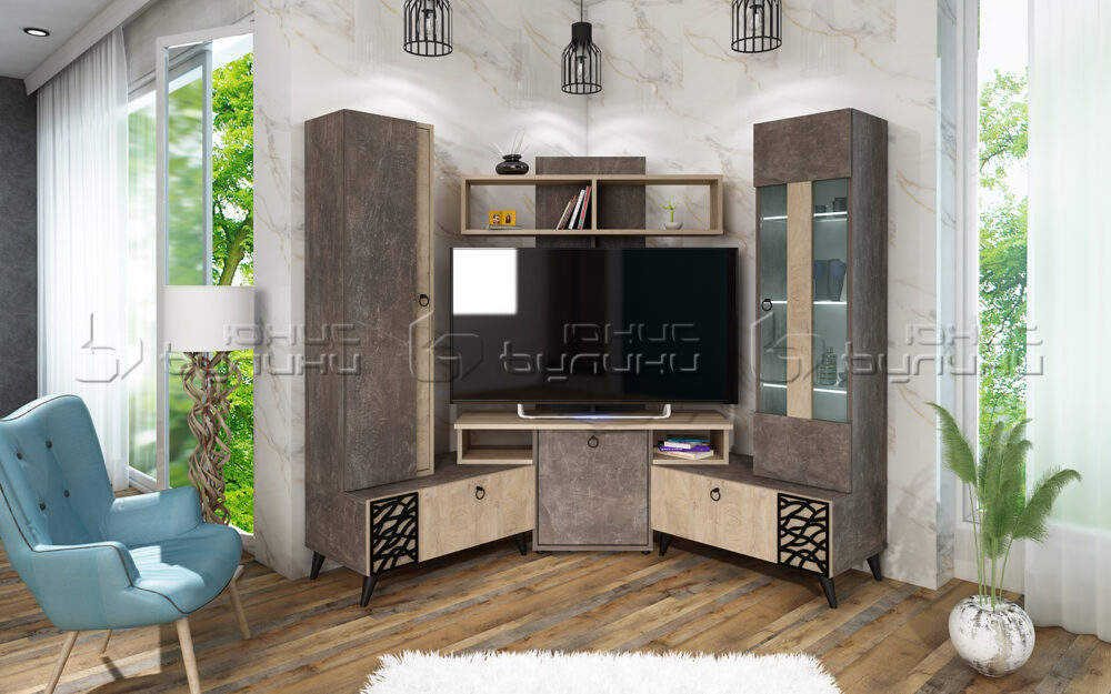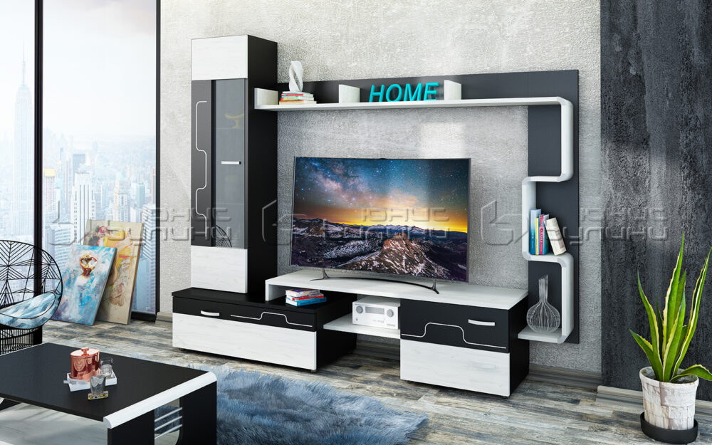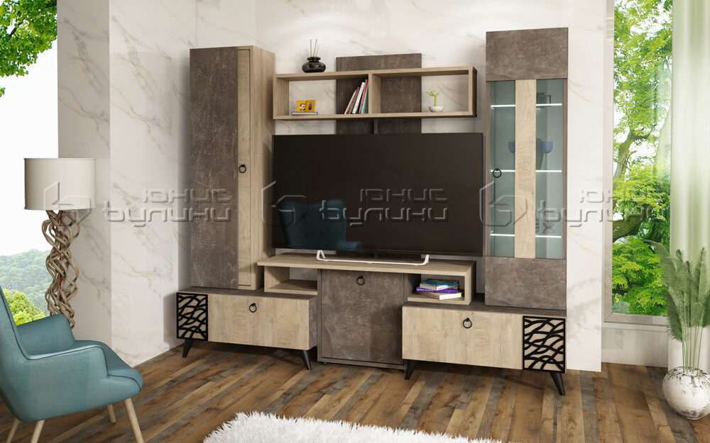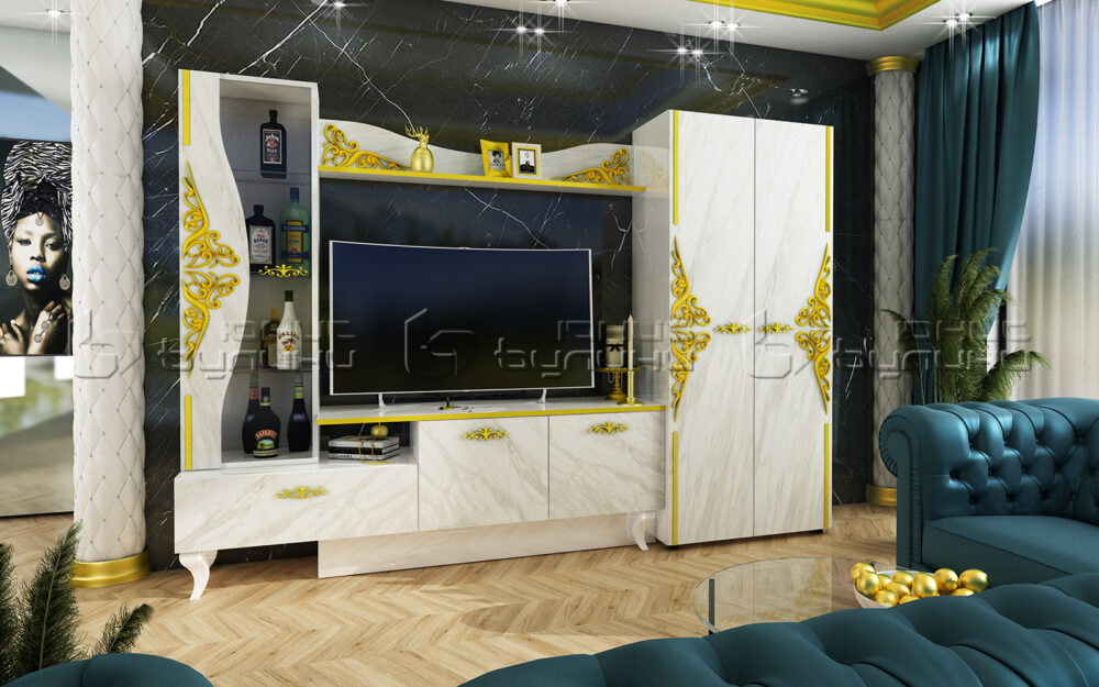 Livingul Baron 3D include dulap înalt cu o ușă și dulap suprapozabil, dulap cu două uși și dulap suprapozabil, 3 vitrine, 3 nișe, 2 sertare și două dulăpioare.