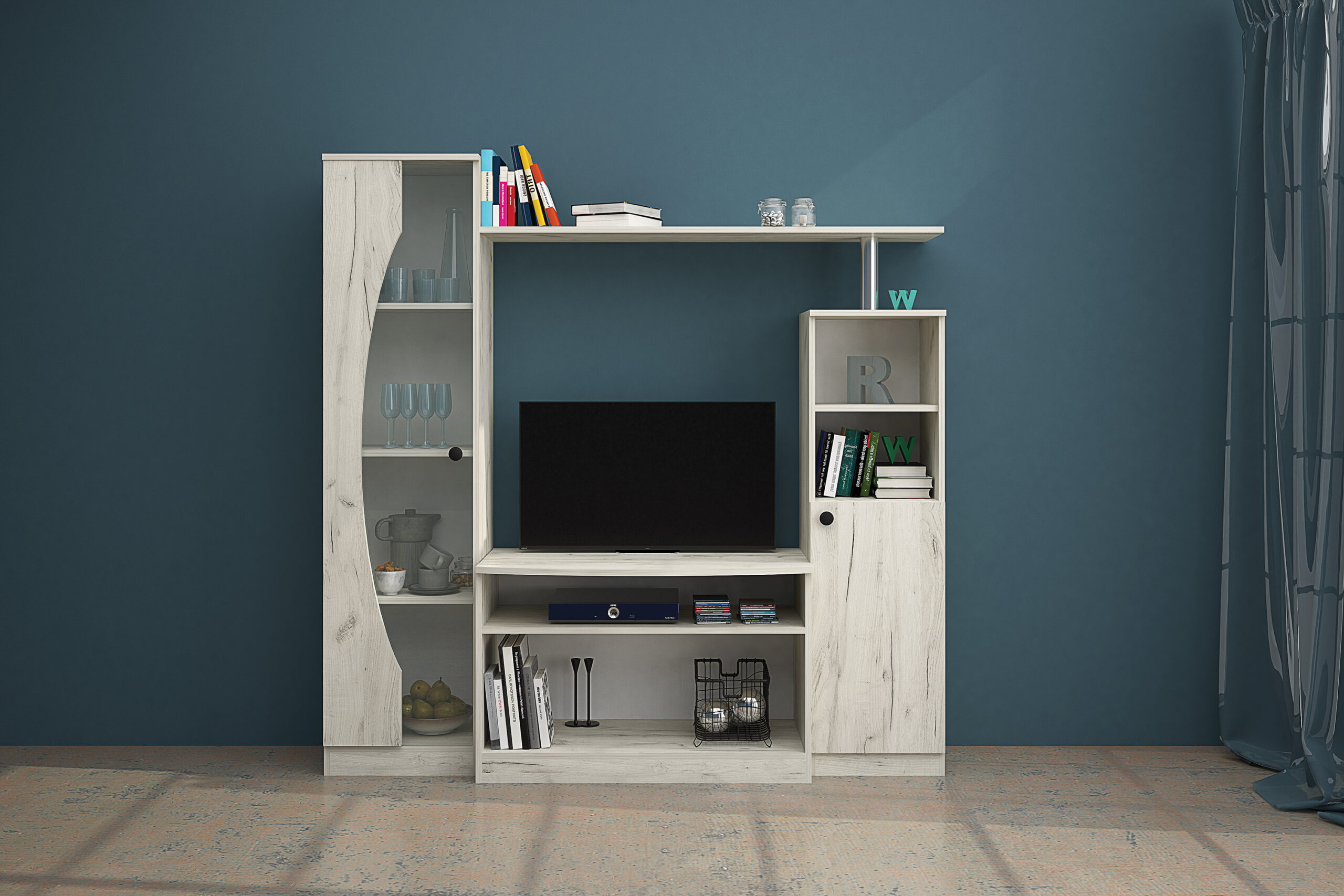 Livingul Marea 1 include: comodă TV cu nișă, dulap cu o ușă și rafturi, vitrină cu trei rafturi, poliță.