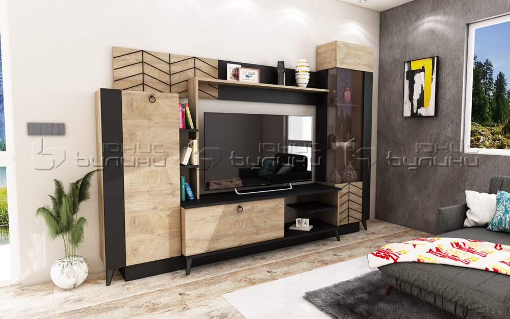 Livingul Marea 1 include: comodă TV cu nișă, dulap cu o ușă și rafturi, vitrină cu trei rafturi, poliță.
