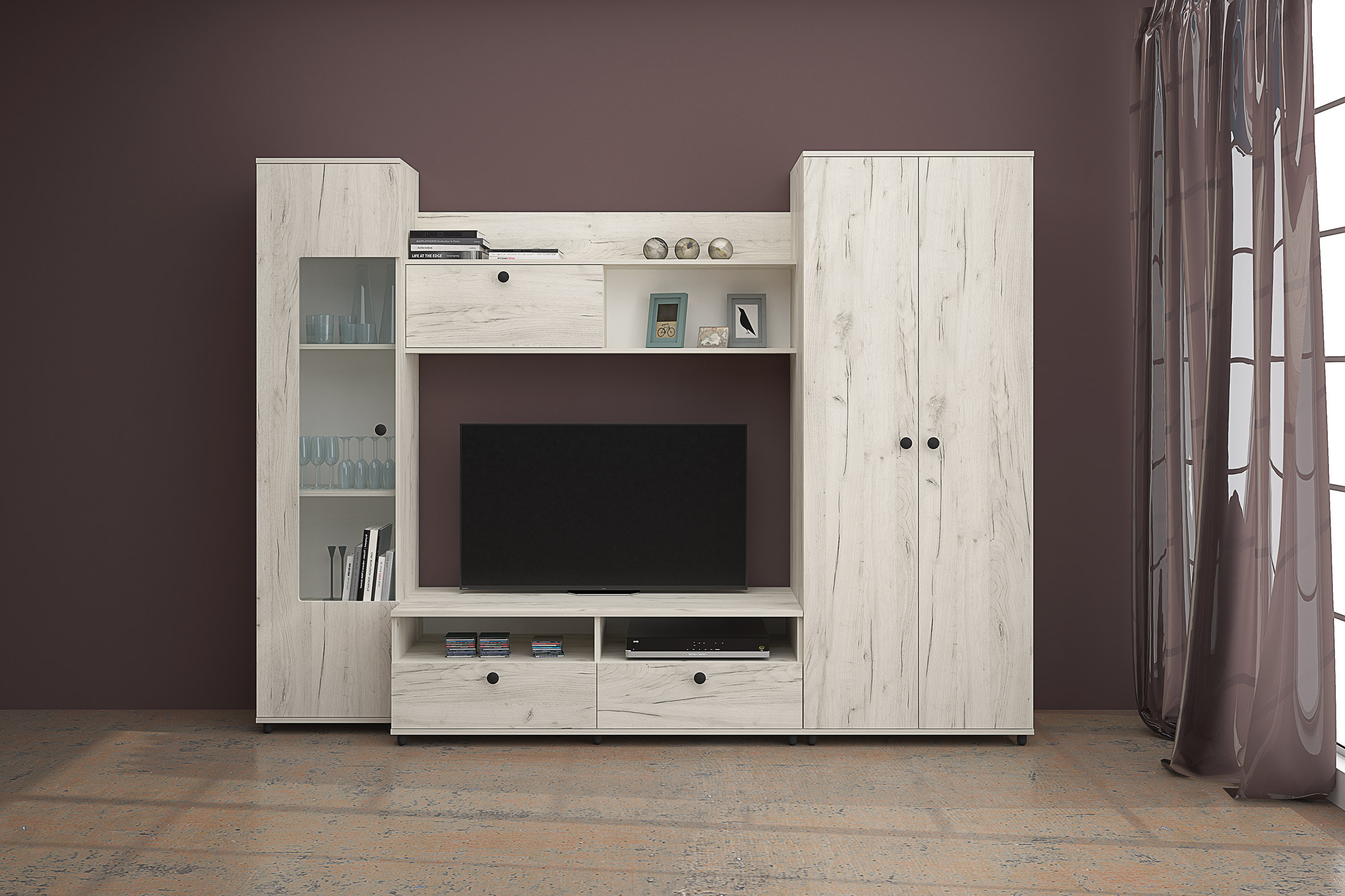 Livingul Marea 2 include: comodă TV cu 2 uși și nișe, etajeră, vitrină și dulap cu 2 uși.