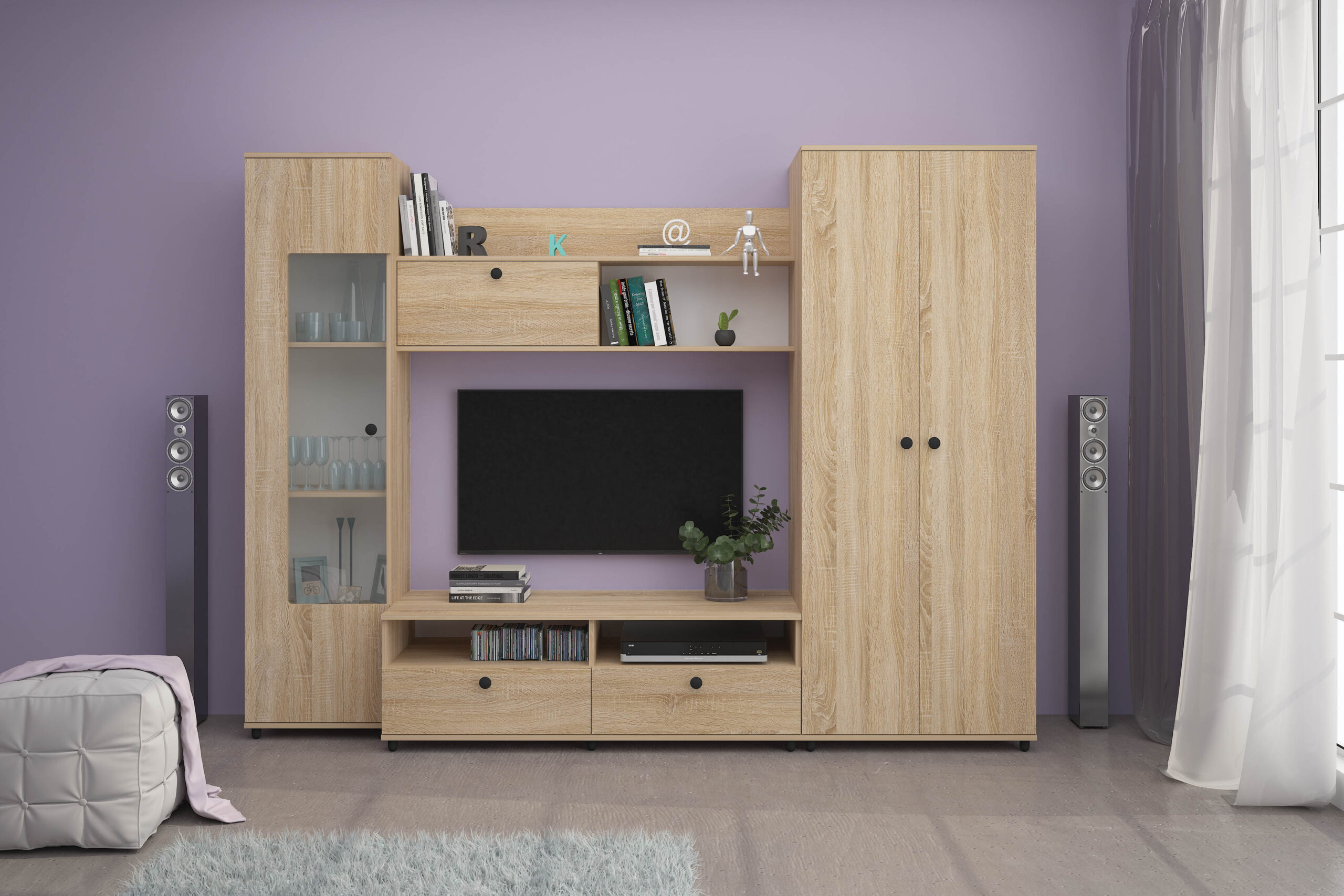 Livingul Marea 2 include: comodă TV cu 2 uși și nișe, etajeră, vitrină și dulap cu 2 uși.