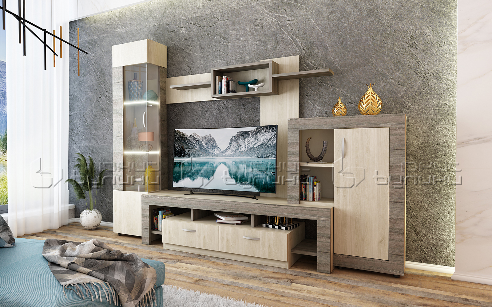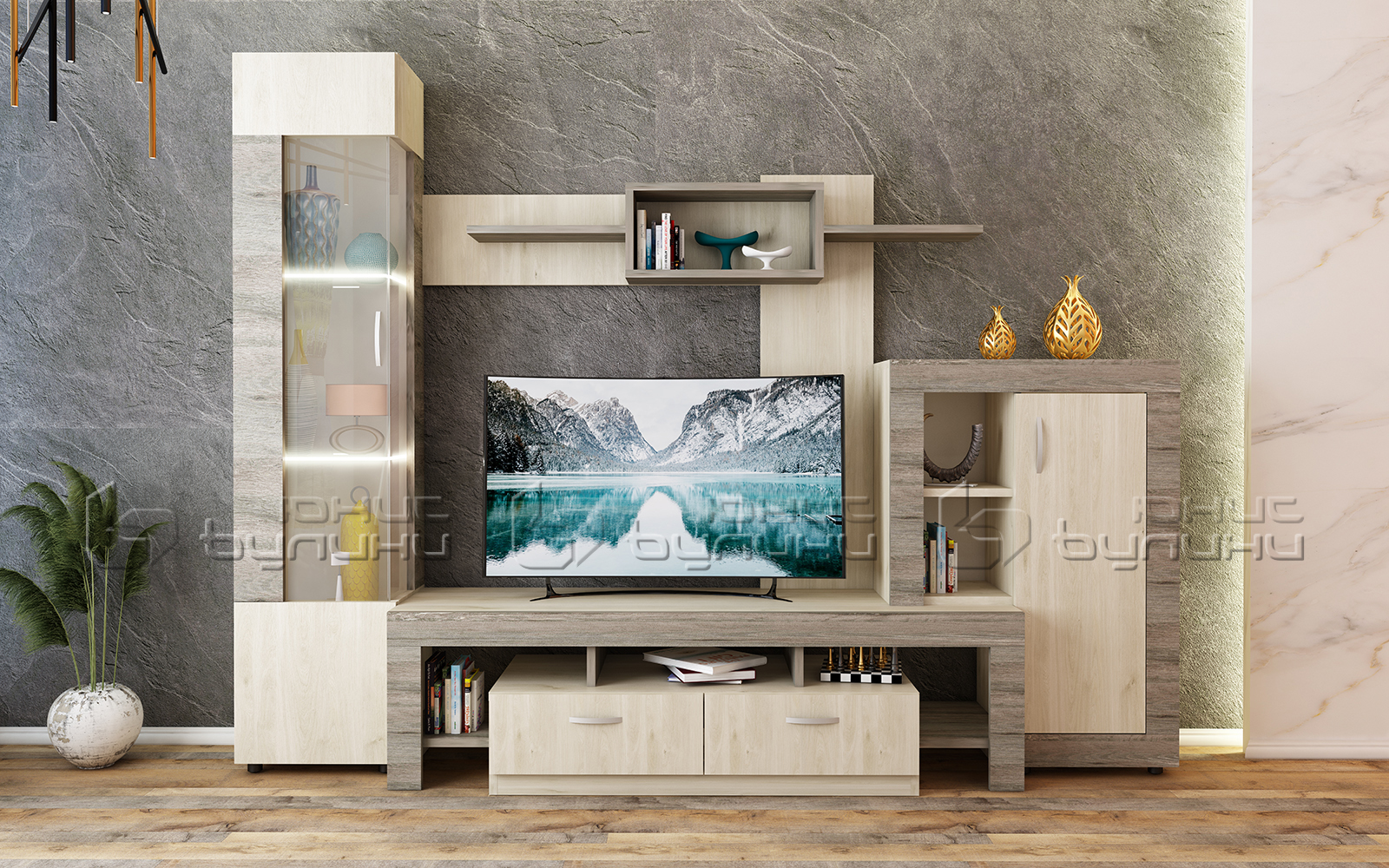 Livingul Samba este format din: scrin TV cu 2 sertare și nișă, dulap cu nișă, etajeră, vitrină cu 3 rafturi.