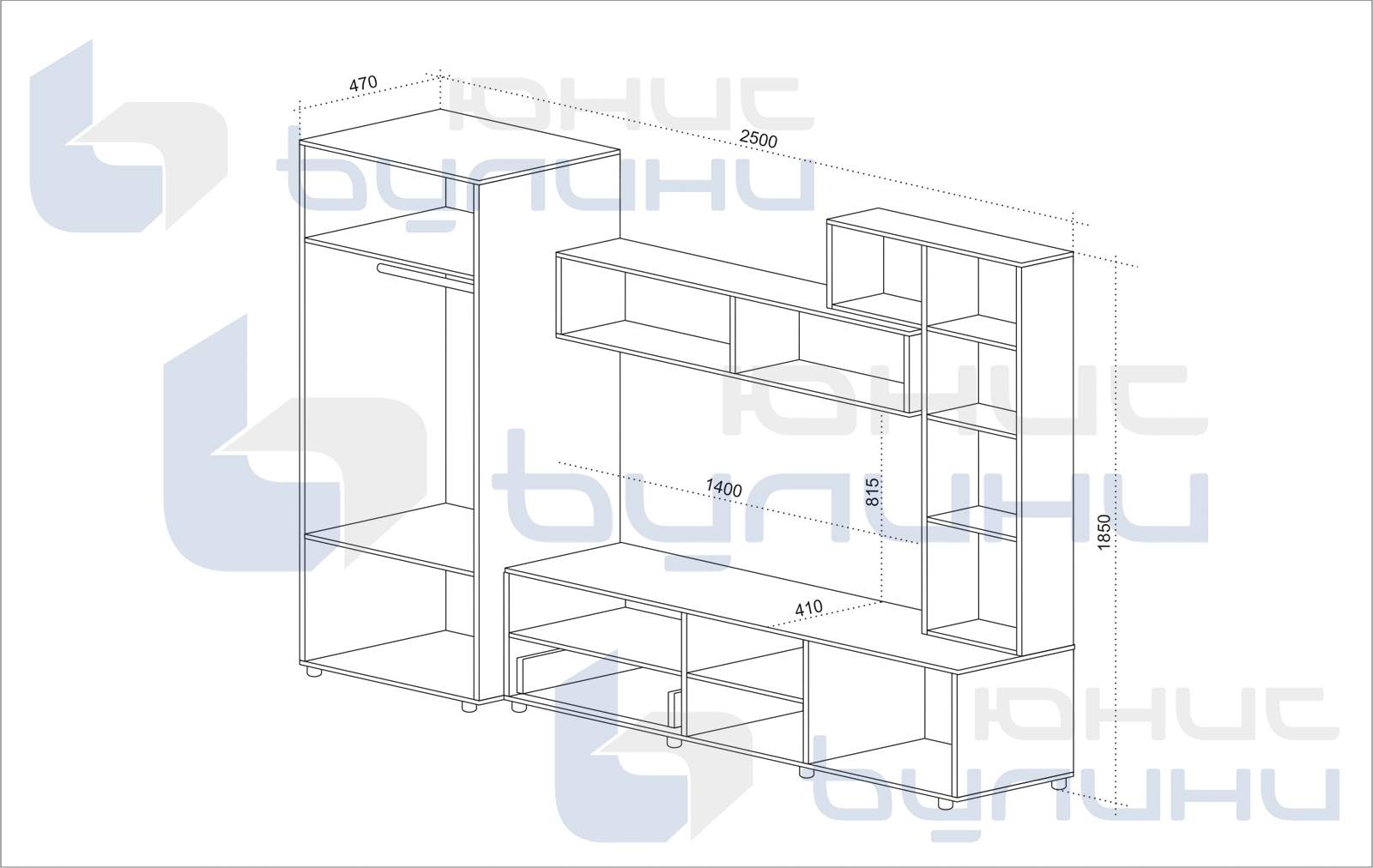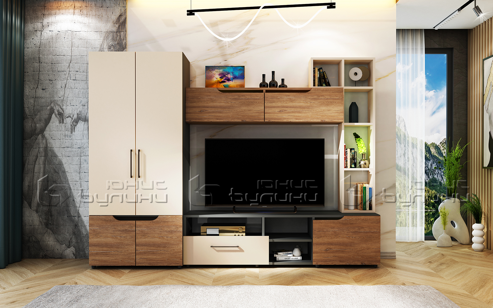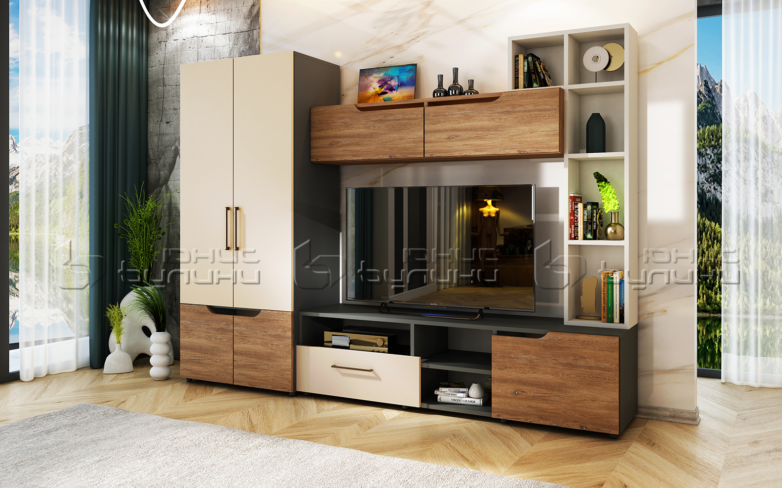 Livingul Sens este format din: comodă TV cu 2 uși și nișe, etajeră, dulăpioare superioare și un dulap cu 4 uși.
