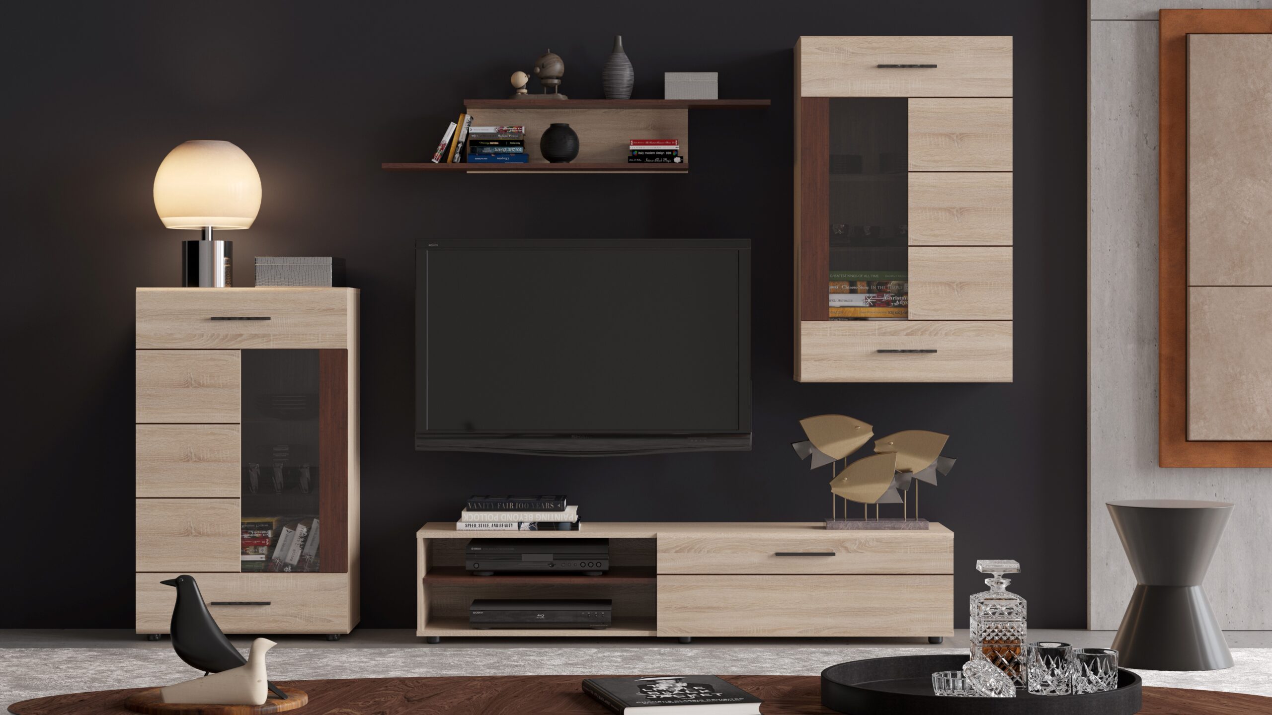 Livingul Solo este compus din: comodă TV cu nișe și sertare, dulap cu vitrină și dulap suspendat cu vitrină, polițe.