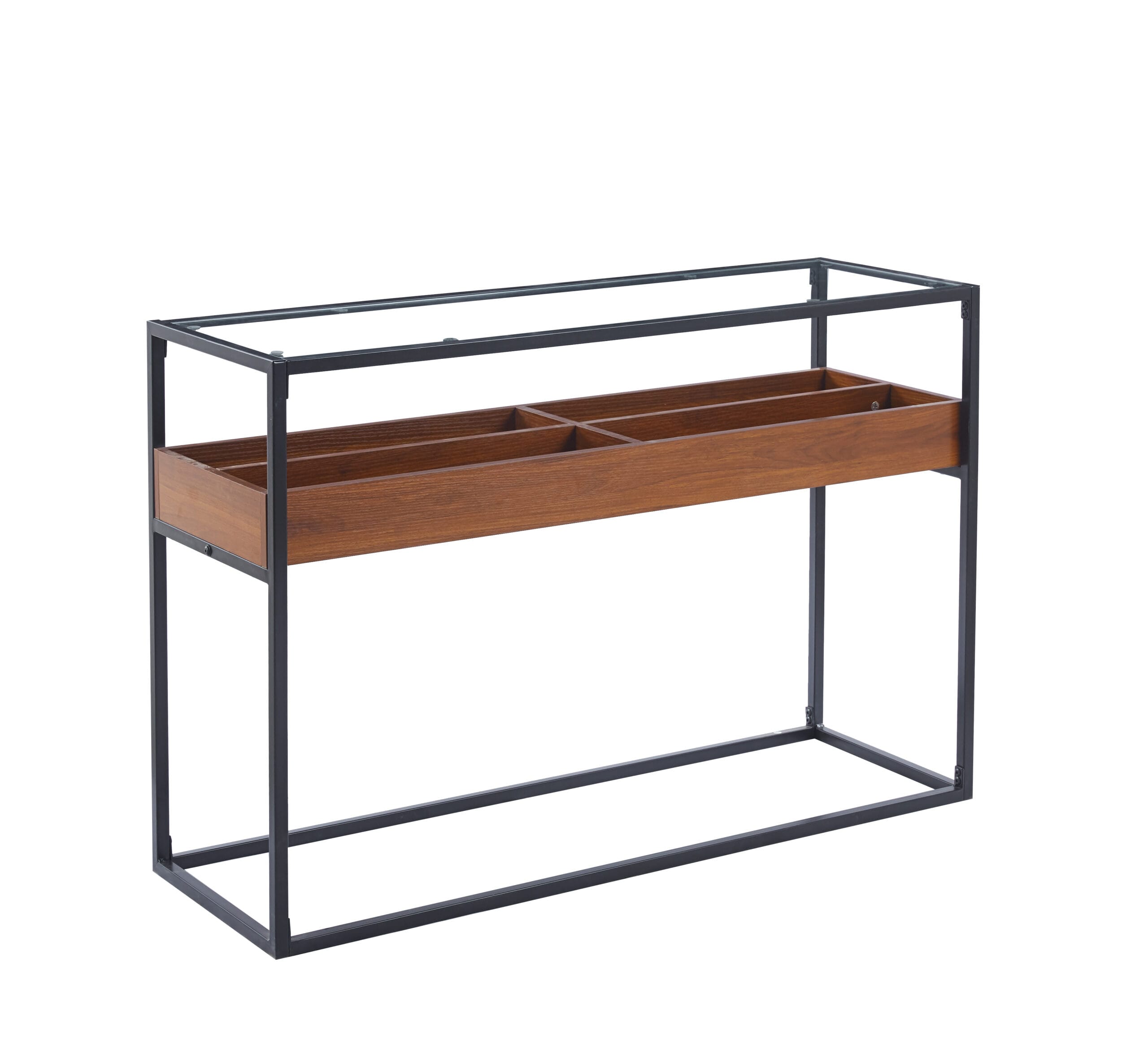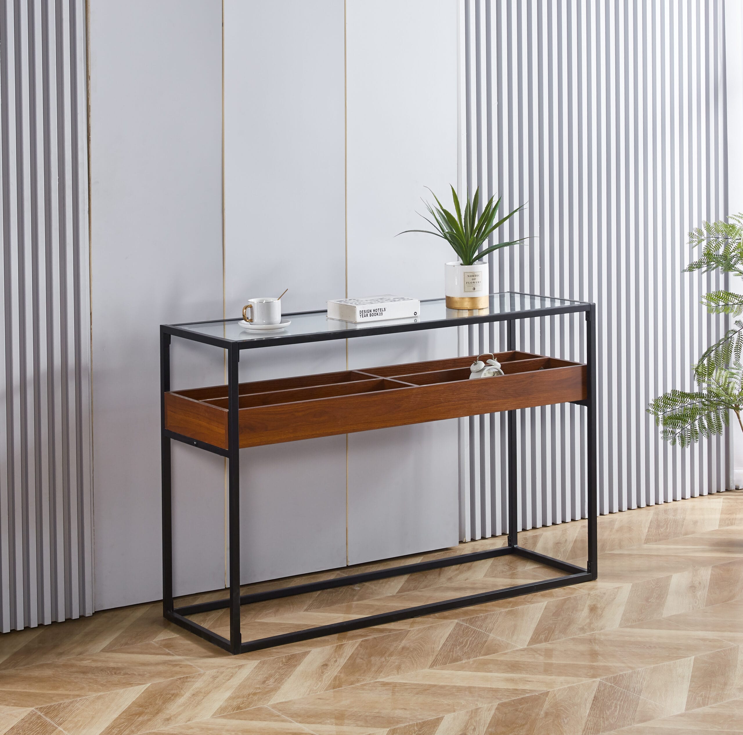 Masa consola Makena este un model modern și funcțional, perfect pentru spații contemporane. Este realizată din sticlă transparentă, integrându-se armonios în orice decor. Dispune de un raft suplimentar din lemn de nuc, care adaugă un contrast plăcut și un plus de căldura designului. Picioarele înalte și subțiri, din metal negru, oferă stabilitate și un aspect elegant, completând estetica generală. Compactă și bine proporționata, masa MAKENA este ideală pentru holuri, livinguri sau spații mai mici, unde combină perfect funcționalitatea cu stilul.