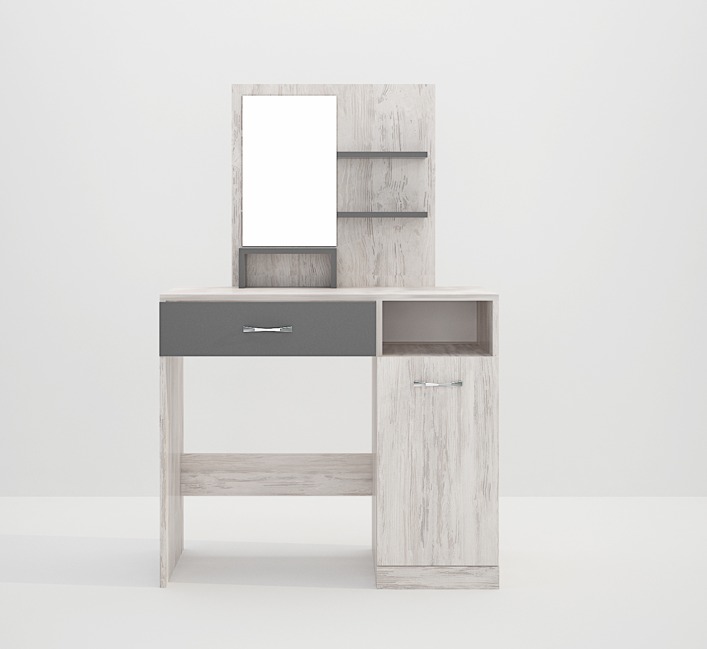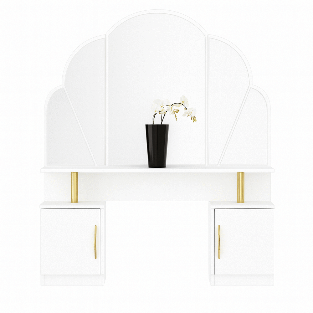Masa de toaletă cu oglindă Andreea este o piesă de mobilier elegantă și funcțională, perfectă pentru a-ți crea propriul spațiu de înfrumusețare. Cu o ușă, un sertar, o nișă și 3 polite, oferă spațiu amplu pentru depozitarea produselor cosmetice, bijuteriilor și a altor accesorii. Designul stilat și practic o transformă într-un element de decor ce îmbină estetica cu funcționalitatea.