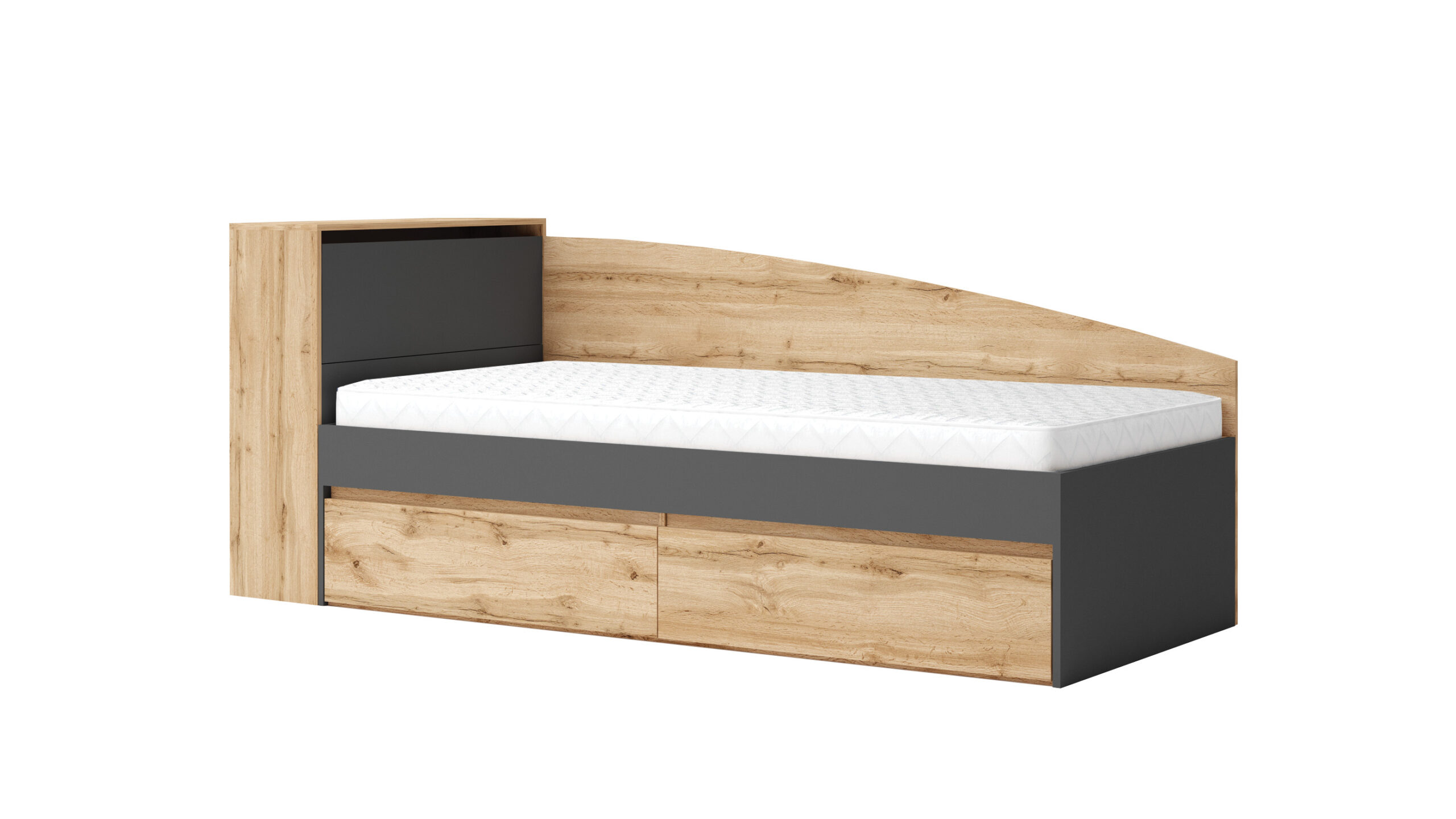 Patul single Leo 90, potrivit pentru saltea de 90×200 cm, este prevăzut cu ladă de depozitare și două sertare integrate, spațioase și ușor accesibile. Acesta oferă un loc amplu pentru păstrarea lenjeriei de pat, a hainelor sau a altor obiecte personale. Designul simplu și funcțional îl face potrivit pentru diverse amenajări interioare.