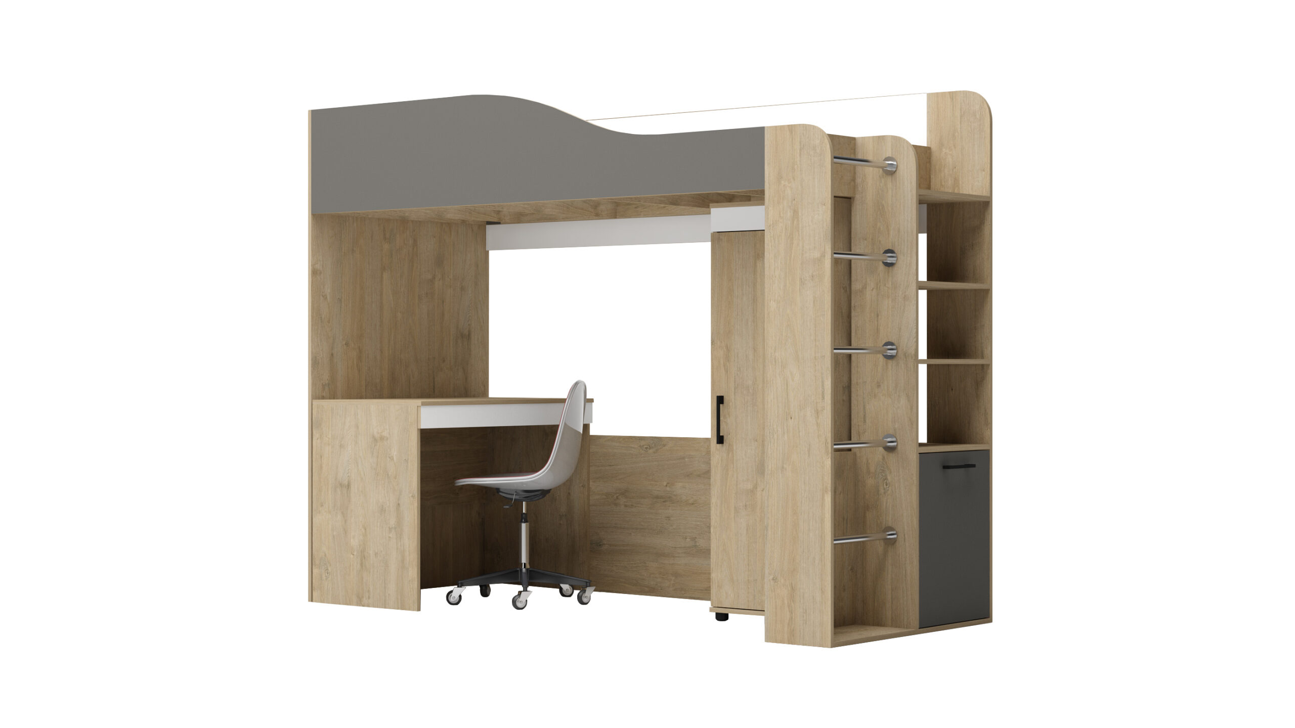 Patul supraetajat Kris M2 este o soluție ingenioasă pentru amenajarea camerelor copiilor sau a spațiilor cu suprafață redusă. Designul său practic și modern incorporează: un birou în partea inferioară, un dulap spațios cu 1 ușă, un dulăpior și trei rafturi, integrate în structura patului, ce oferă un spațiu generos de depozitare pentru jucării, cărți si alte obiecte personale, un pat superior cu tăblie laterală, oferind siguranță și confort suplimentar. Prezența scării facilitează accesul la patul de sus.