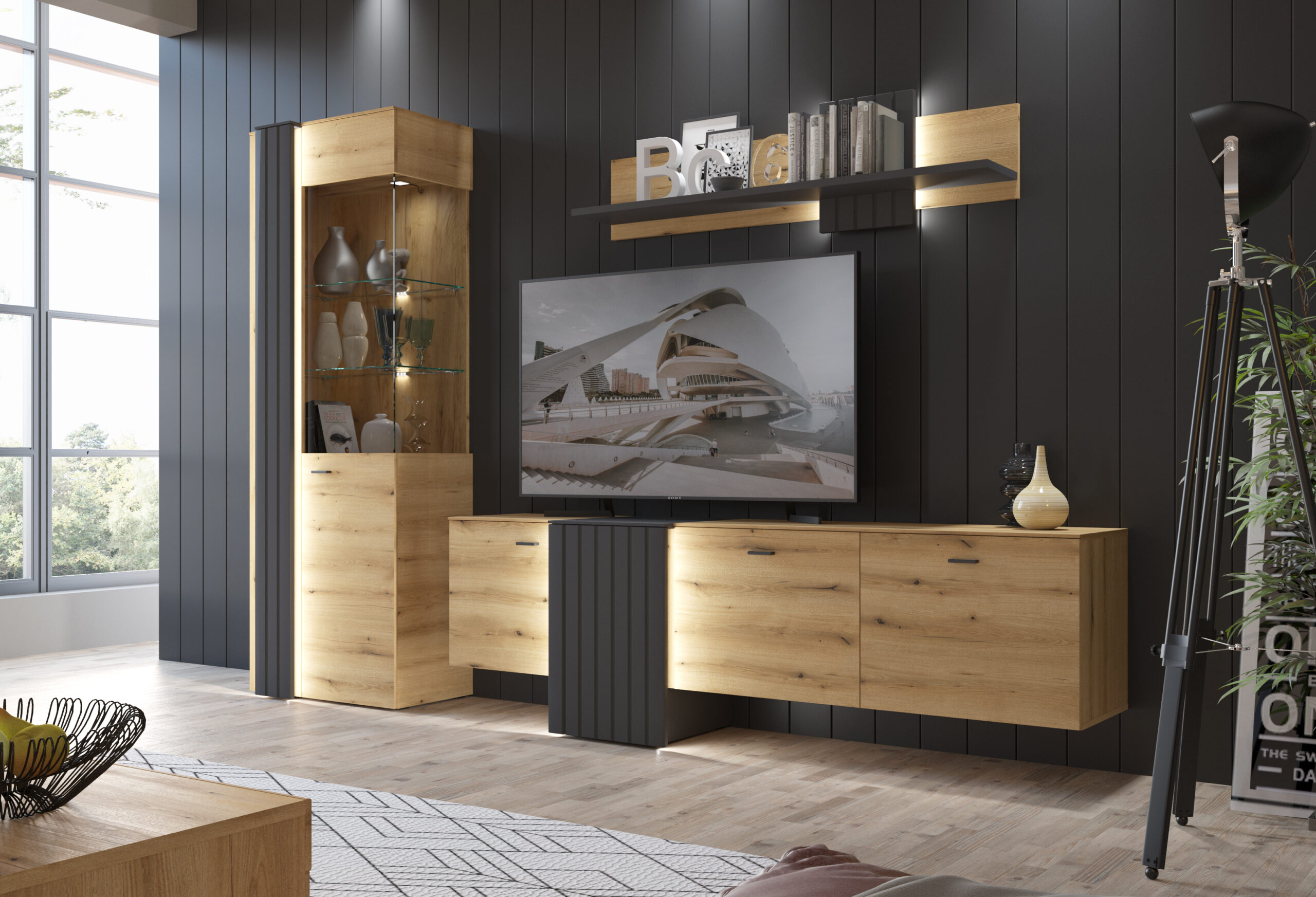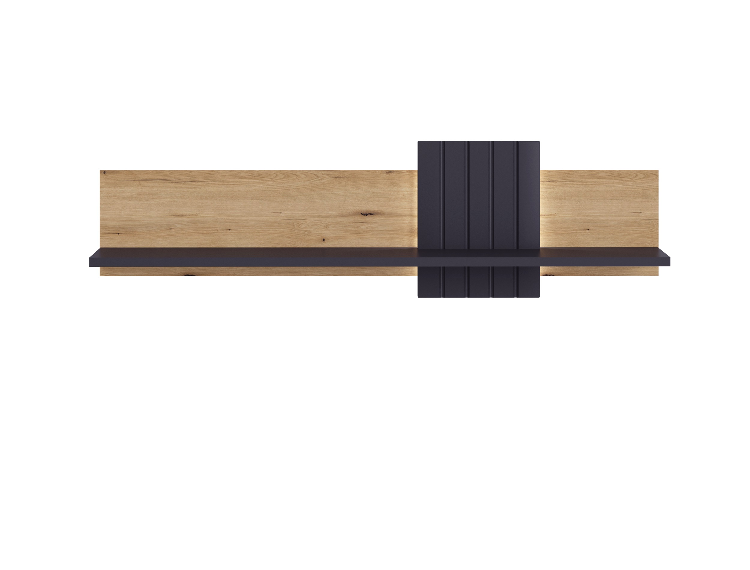 Polița Verdana SNNP05 se remarcă prin designul ei sofisticat și stilat, combinând cu succes nuanțele calde ale stejarului cu eleganța griului închis. Această combinație cromatică permite o integrare flexibilă în diverse amenajări interioare. Designul se axează pe estetica și funcționalitate, oferind suficient spațiu pentru expunerea unor obiecte decorative, cărți, plante sau accesorii.