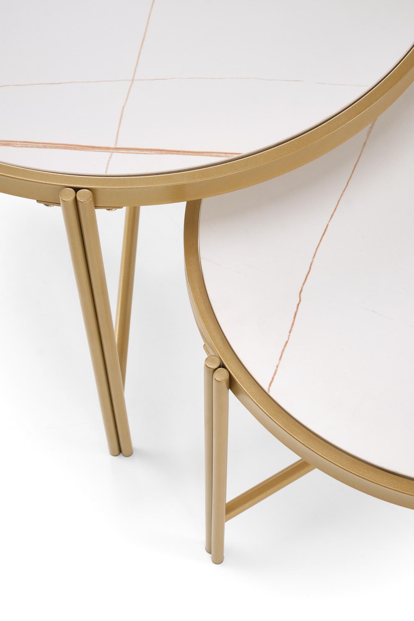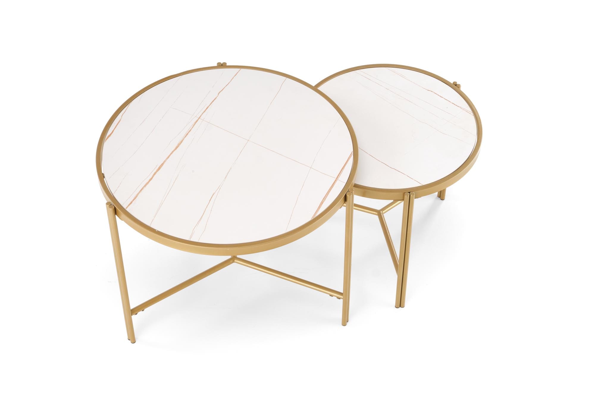 Setul de 2 măsuțe de cafea Fatima realizate din piatră sinterizată și metal, exprimă o combinație de rezistență și eleganță. Suprafețele netede ale pietrei sinterizate creează un aspect curat și modern, iar picioarele metalice oferă stabilitate și durabilitate. Forma compactă și designul minimalist le fac potrivite și pentru spatii mici, fără a compromite stilul și funcționalitatea.