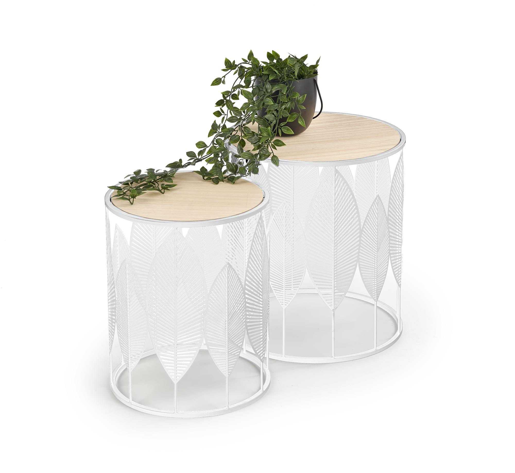 Setul de doua măsuțe de cafea Folla combină eleganța și funcționalitatea într-un mod armonios. Forma compactă și stilată le face potrivite pentru diverse spații, de la livinguri minimaliste până la camere de zi mai ample. Materialele folosite, MDF și metal, garantează o calitate superioara și un aspect estetic plăcut.