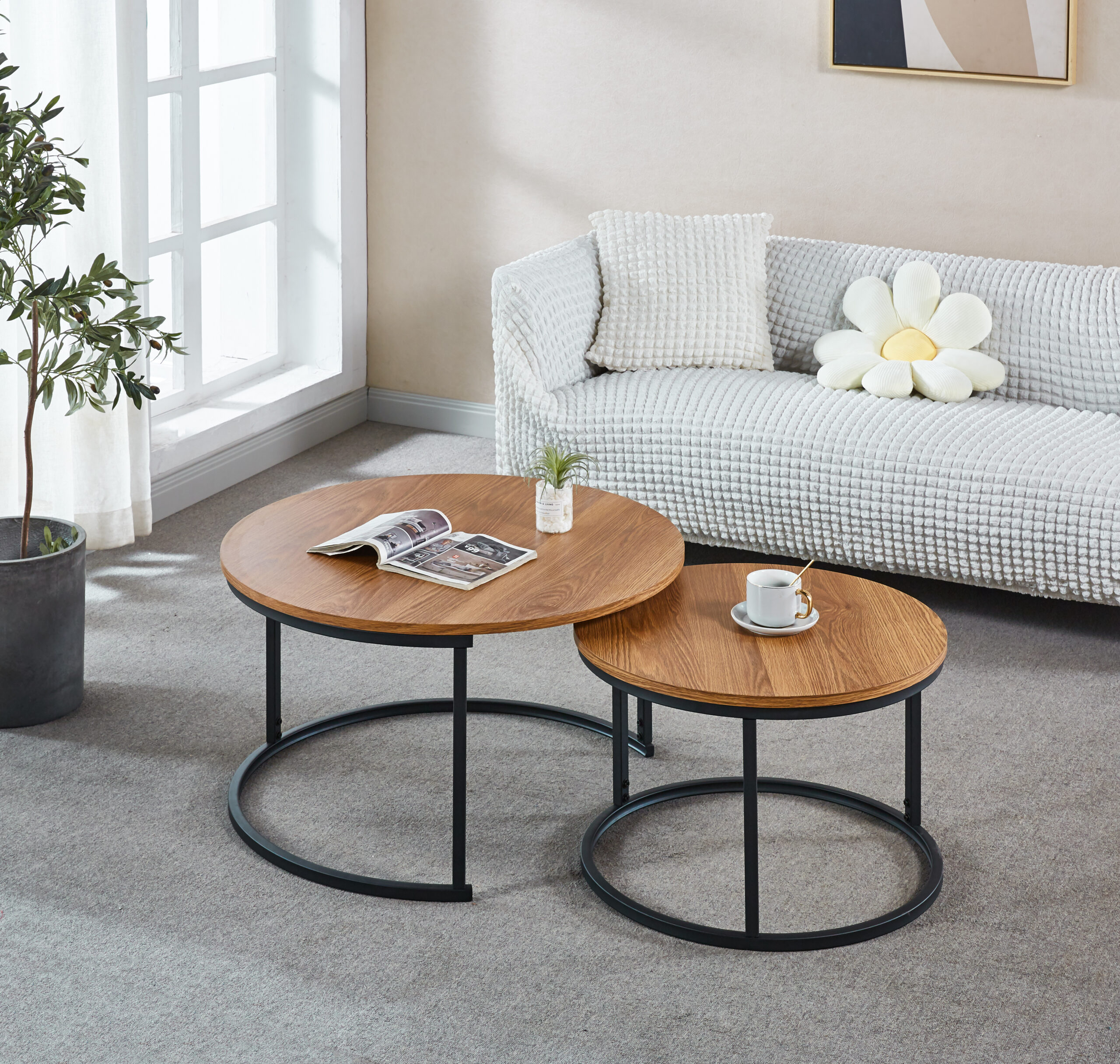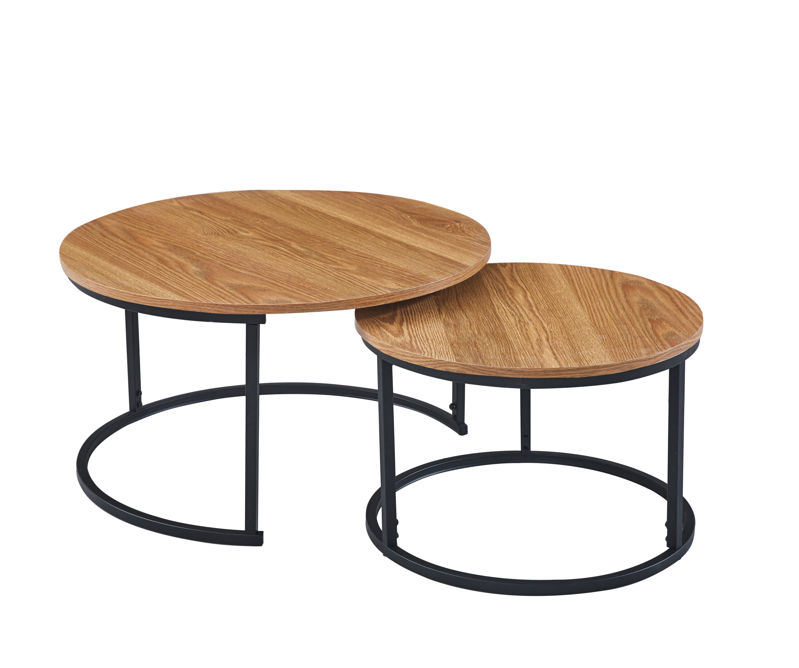 Setul de 2 măsuțe de cafea Natalia combină eleganță și funcționalitatea într-un mod armonios. Forma compactă și stilată le face potrivite pentru diverse spații, de la livinguri minimaliste până la camere de zi mai ample. Materialele folosite, MDF și metal, garantează o calitate superioară și un aspect estetic plăcut.