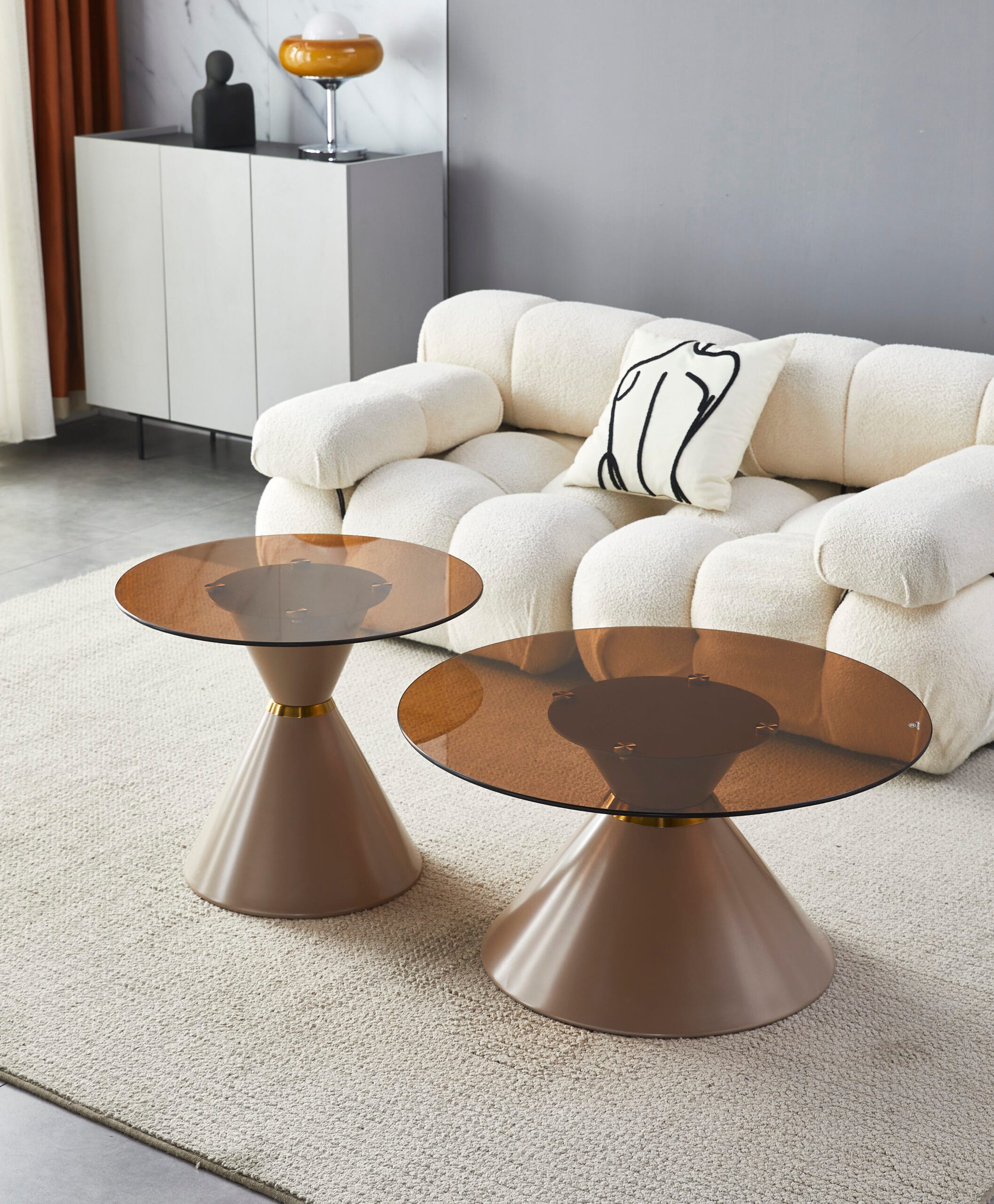 Setul de 2 măsuțe de cafea Rebeca rotunde cu laturi din sticlă transparentă în nuanțe de maro și șampani, aduce o notă de eleganță și rafinament în orice încăpere. Dimensiunile compacte le fac ideale pentru spații mici, fiind extrem de practice și ușor de integrat în orice colțișor al locuinței. Este o alegere excelenta pentru cei care apreciază simplitatea și eleganta în design.