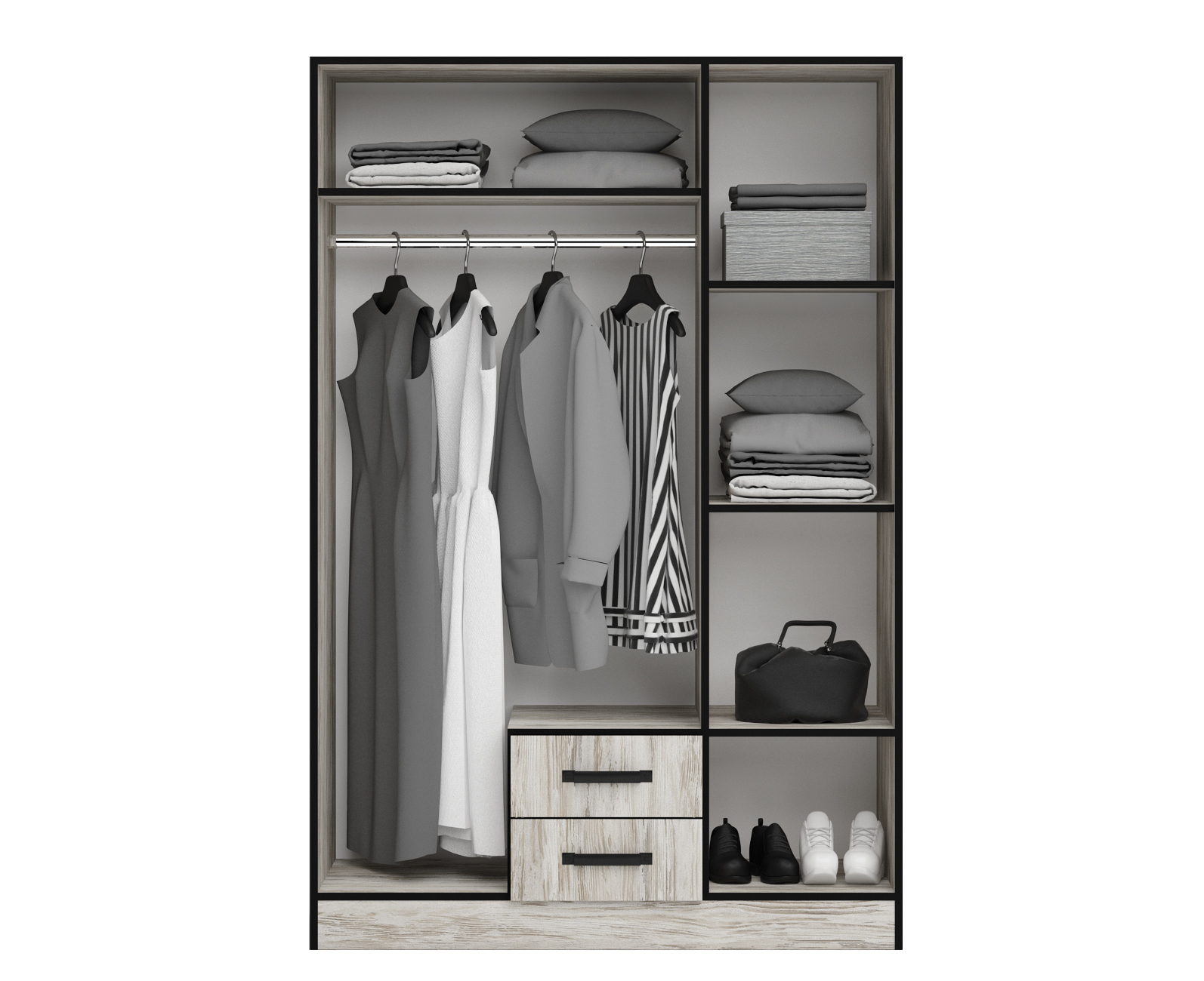 Dulapul generos, echipat cu trei uși cu mecanism soft-close, două sertare, oglinzi, bară pentru umerașe și numeroase rafturi, oferă un spațiu amplu pentru depozitarea hainelor și a altor obiecte personale.