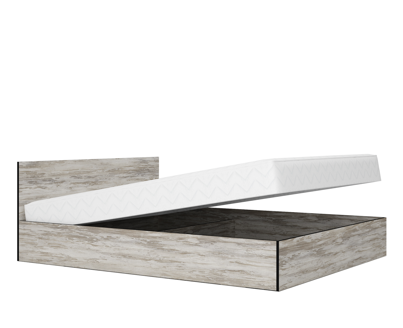 Piesa centrală este un pat spațios și confortabil cu mecanism de ridicare cu amortizoare, pentru o deschidere și un acces mai ușor la spațiul de sub saltea.