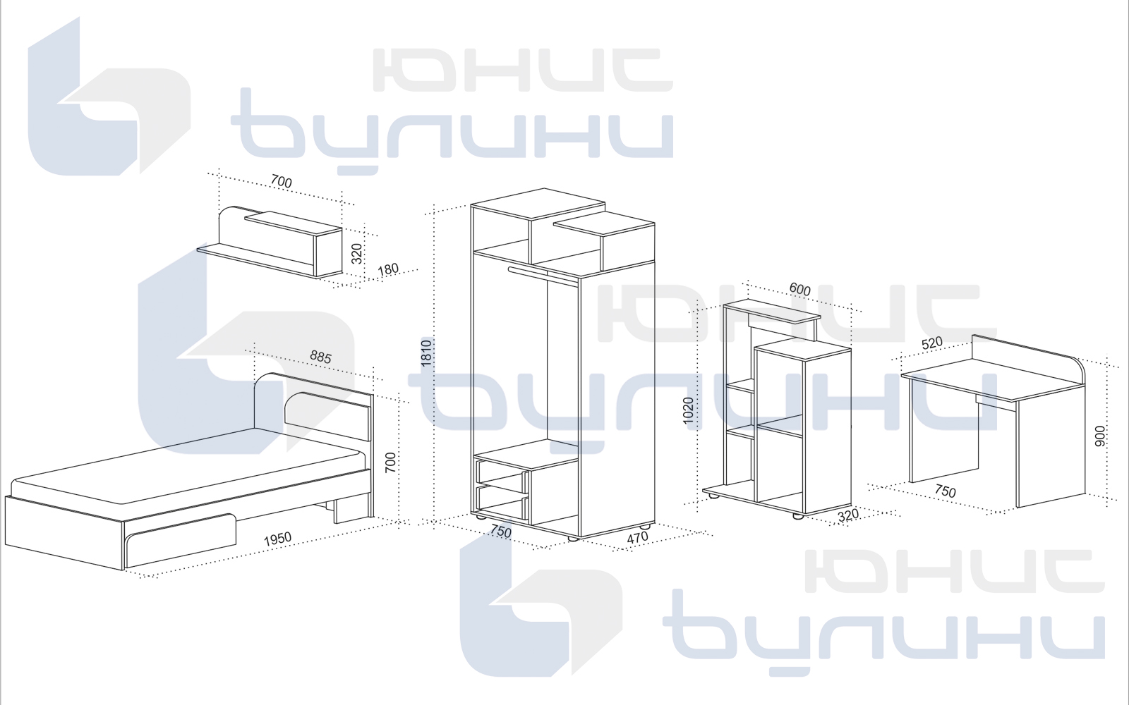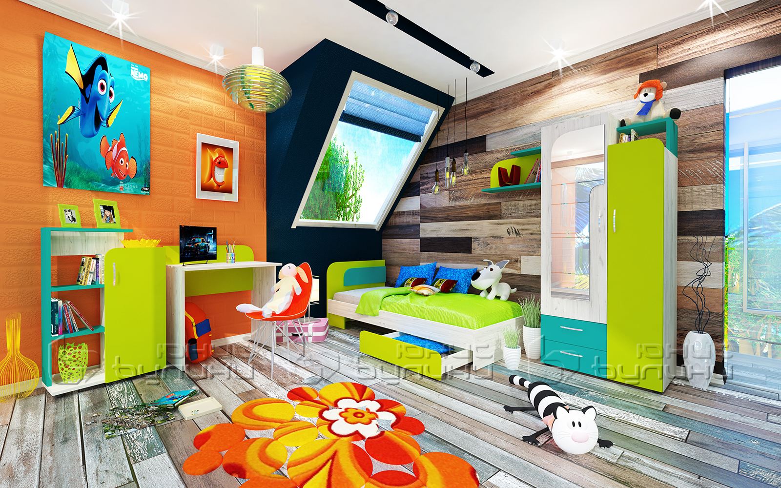 Setul de dormitor Nemo, cu design modern și culori vibrante de turcoaz și verde, transformă camera copilului într-un spațiu plin de viață, stimulând imaginația. Patul spațios asigură un somn odihnitor, iar biroul oferă un spațiu practic pentru studiu și activități creative. Dulapul, cu sertare și ușă cu oglindă, facilitează organizarea hainelor, în timp ce etajera de perete adaugă spațiu pentru cărți și decorațiuni. Comoda versatilă, cu rafturi deschise și dulap cu ușă, oferă spații diverse pentru jucării și alte obiecte.