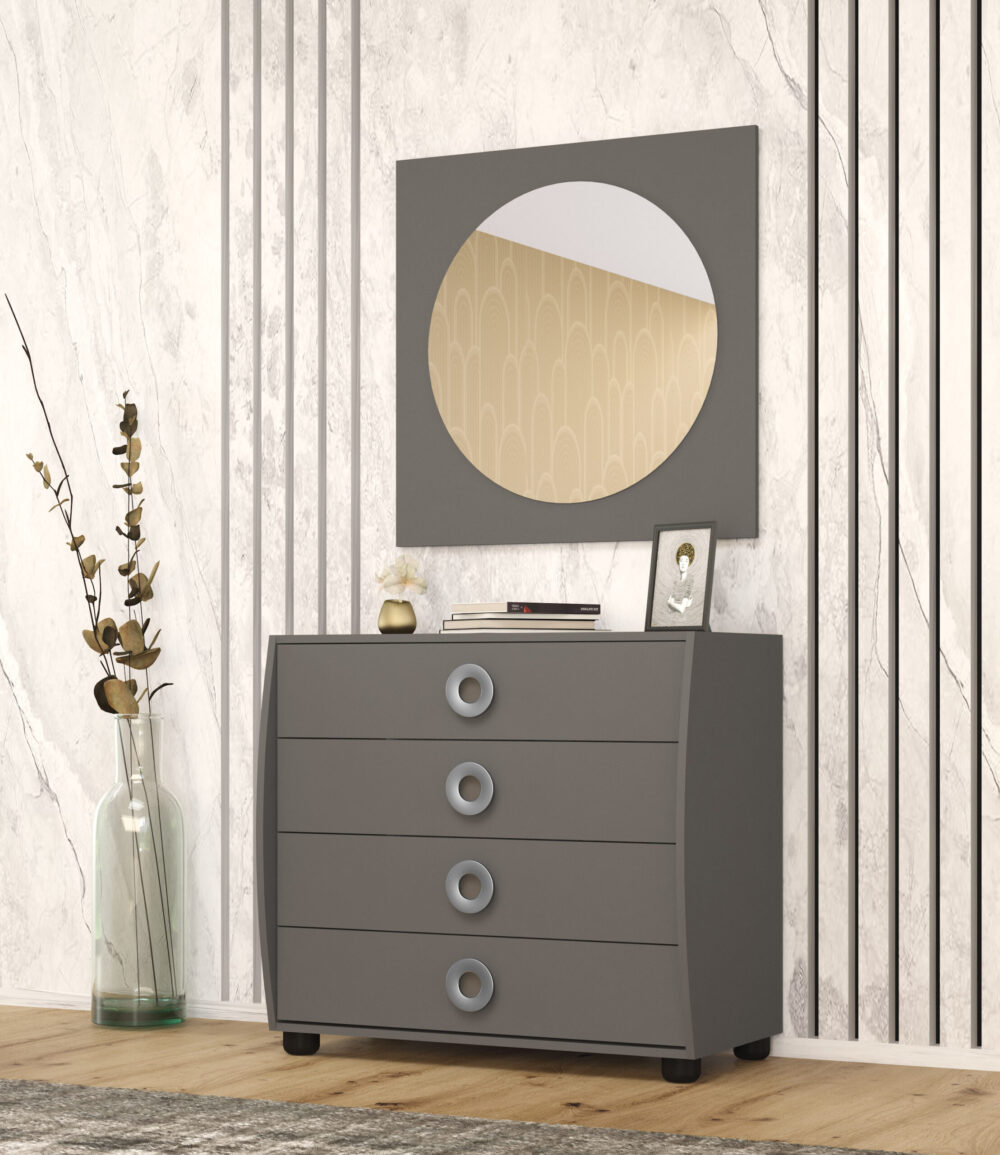 Patul dublu, cu tăblia decorată cu un ornament gri satinat, devine punctul central al camerei. Dressingul spațios, cu uși glisante și oglinzi ample, maximizează spațiul și adaugă luminozitate. Pentru un plus de confort și funcționalitate, puteți opta pentru mecanisme de închidere silențioasă a ușilor și o comodă cu sertare integrată în interiorul dulapului. Cele 2 noptiere elegante completează armonios ansamblul, oferind un spațiu perfect pentru relaxare și organizare.