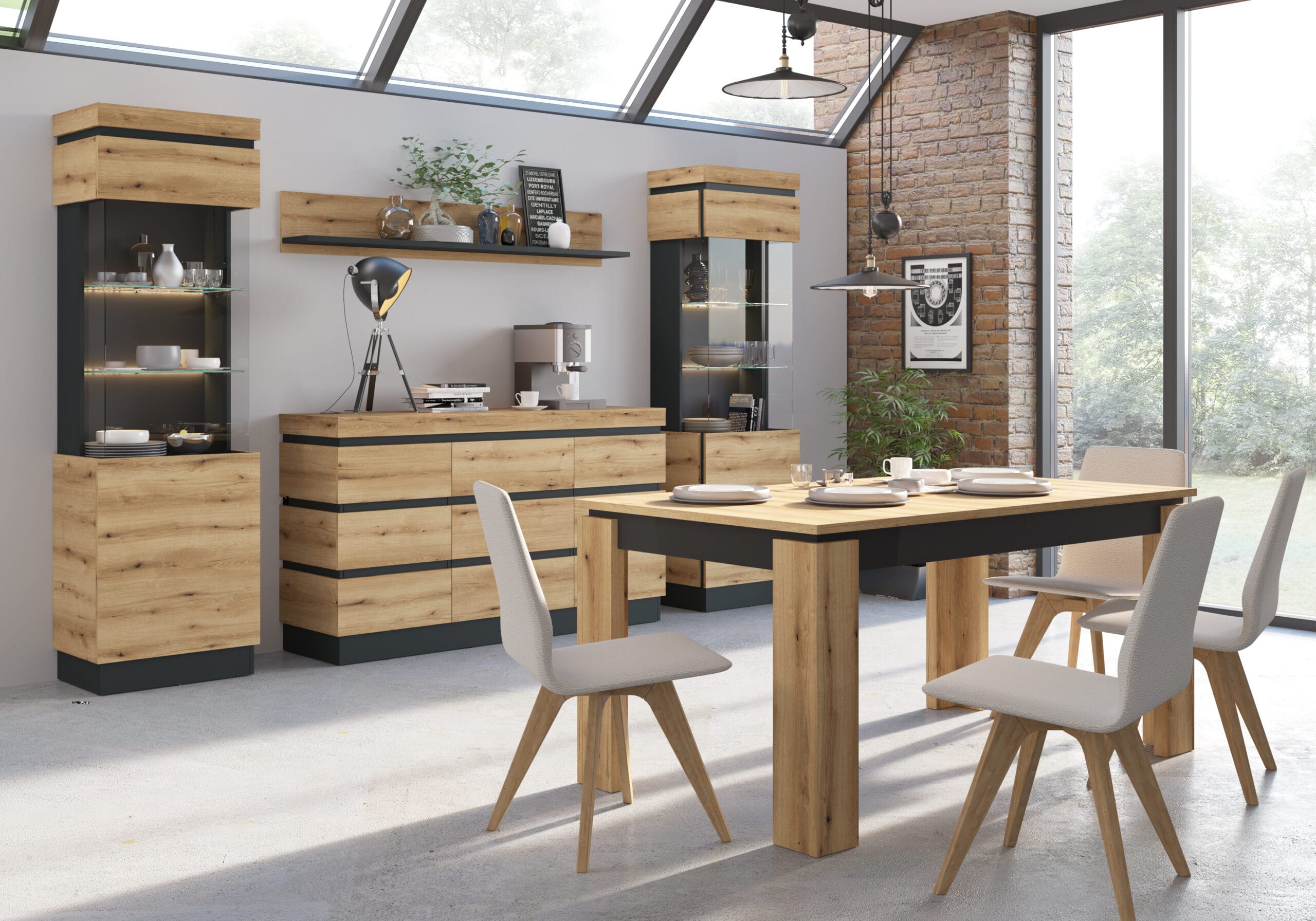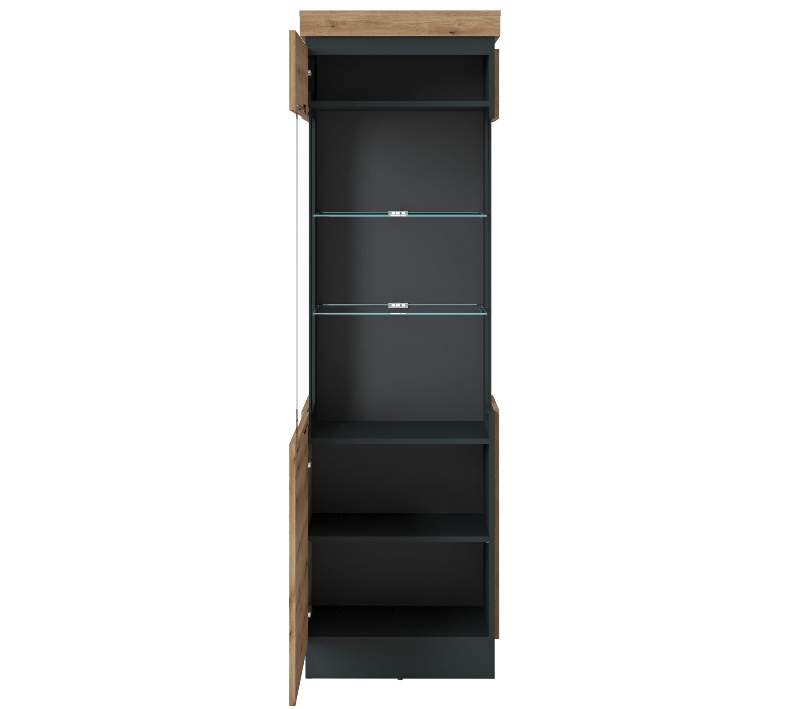 Vitrina Corte CORV02L, cu o combinație elegantă de stejar nisipiu și gri, se remarcă prin cele 5 rafturi care oferă un spațiu amplu de depozitare. Rafturile din sticlă adaugă un plus de eleganță, și permit expunerea obiectelor decorative în mod atractiv. Designul modern și atrăgător o transformă într-o piesă de mobilier deosebită, funcțională și estetică, perfectă pentru un interior stilat.