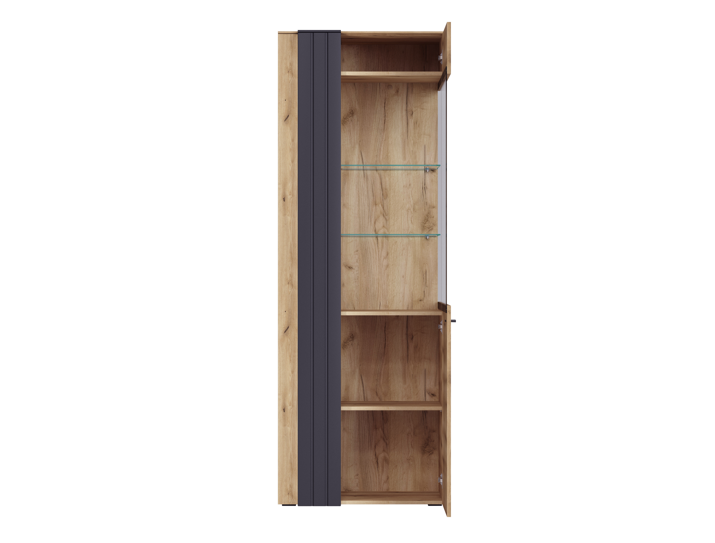 Vitrina Verdana SNNV02, în culorile stejar nisipiu și gri închis, dispune de 5 rafturi, oferind un spațiu generos pentru depozitarea obiectelor, suvenirelor și decorațiilor. Designul acestei vitrine este practic și modern.